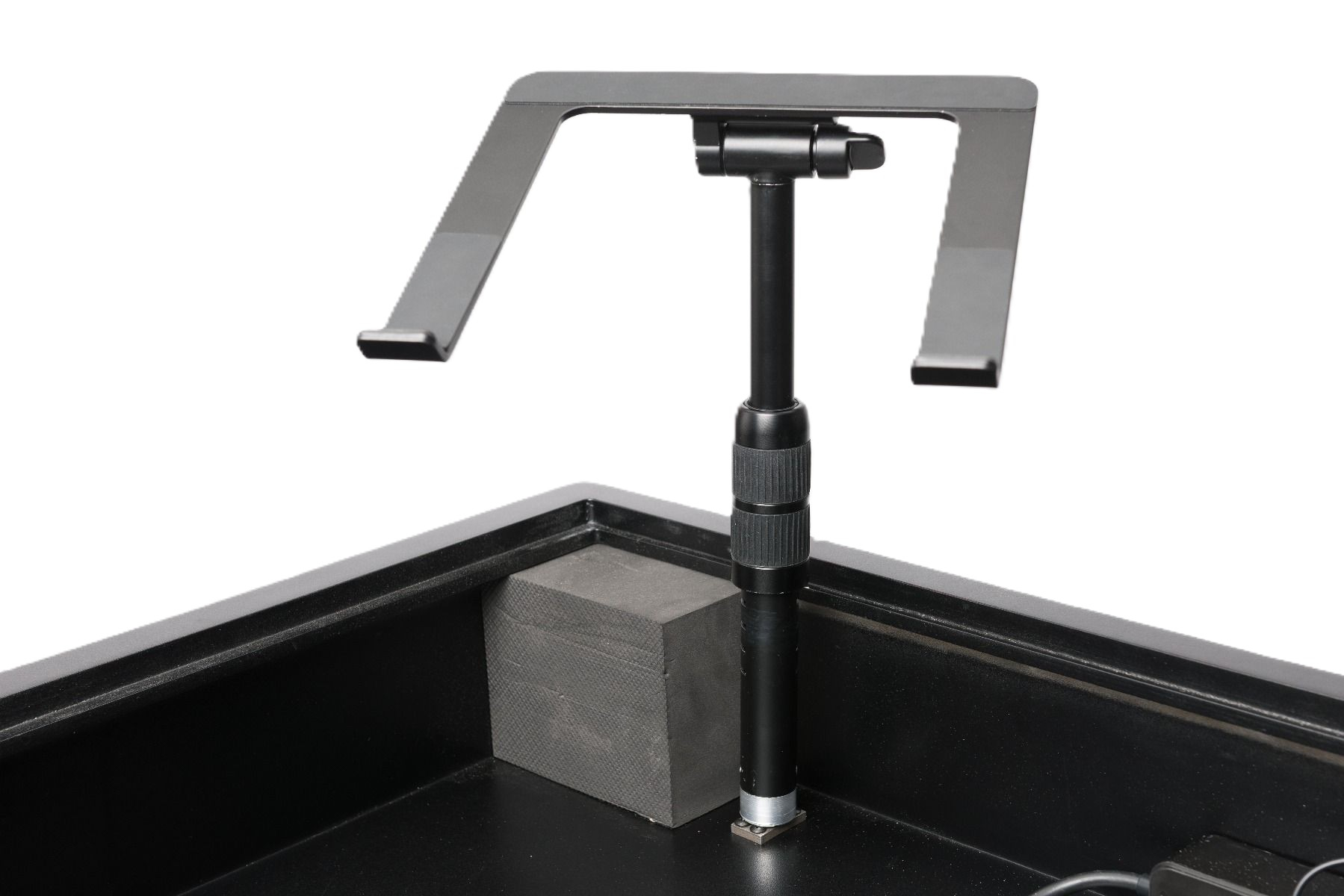 Le stand ordinateur portable réglable en hauteur, inclinaison et rotation peut être monté à gauche ou à droite selon l’ergonomie souhaitée. Cette modularité permet d’adapter le poste de travail aux préférences du DJ et aux contraintes d’espace.