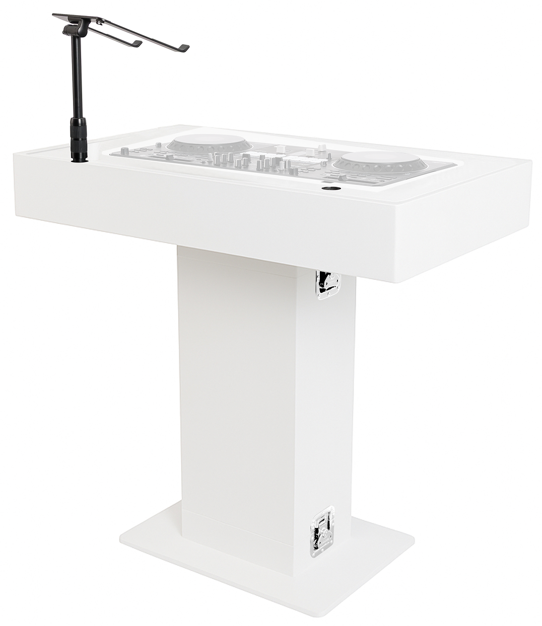 Il dispose de deux supports filetés 3/8 pouces intégrés pour fixer un ou deux ordinateurs portables, un haut-parleur de monitoring ou un pied microphone compatible. Le support laptop inclus est réglable en hauteur, inclinaison et rotation, offrant une ergonomie adaptée aux préférences de chaque DJ.