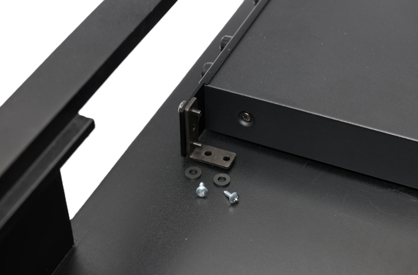 Le booth DJ intègre deux supports permettant l’installation d’un appareil rack 19 pouces 1 U sous le contrôleur. Cette configuration est adaptée pour un processeur audio ou un module complémentaire. L’intégration est pensée pour rester accessible tout en conservant un câblage discret grâce aux passages prévus.