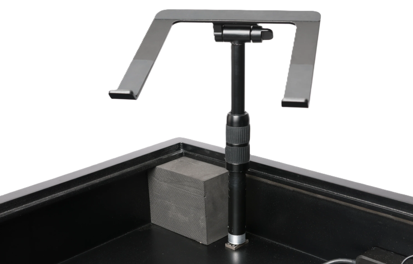 Les deux filetages 3/8 pouce permettent d’installer un ou deux ordinateurs portables, une enceinte de monitoring ou un pied microphone compatible. Le support laptop fourni est réglable en hauteur, inclinaison et rotation.