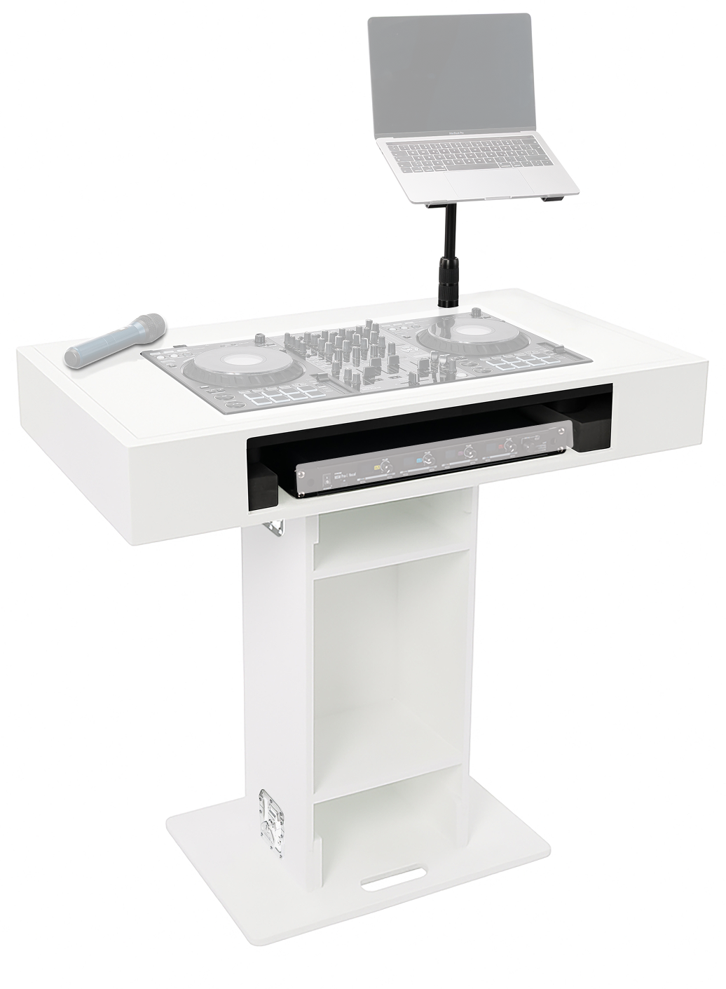 La finition blanche texturée apporte une intégration visuelle adaptée aux environnements modernes. Cette conception favorise une présentation structurée et cohérente, essentielle pour les DJs professionnels attachés à l’image de marque et à la qualité d’installation lors de prestations publiques.