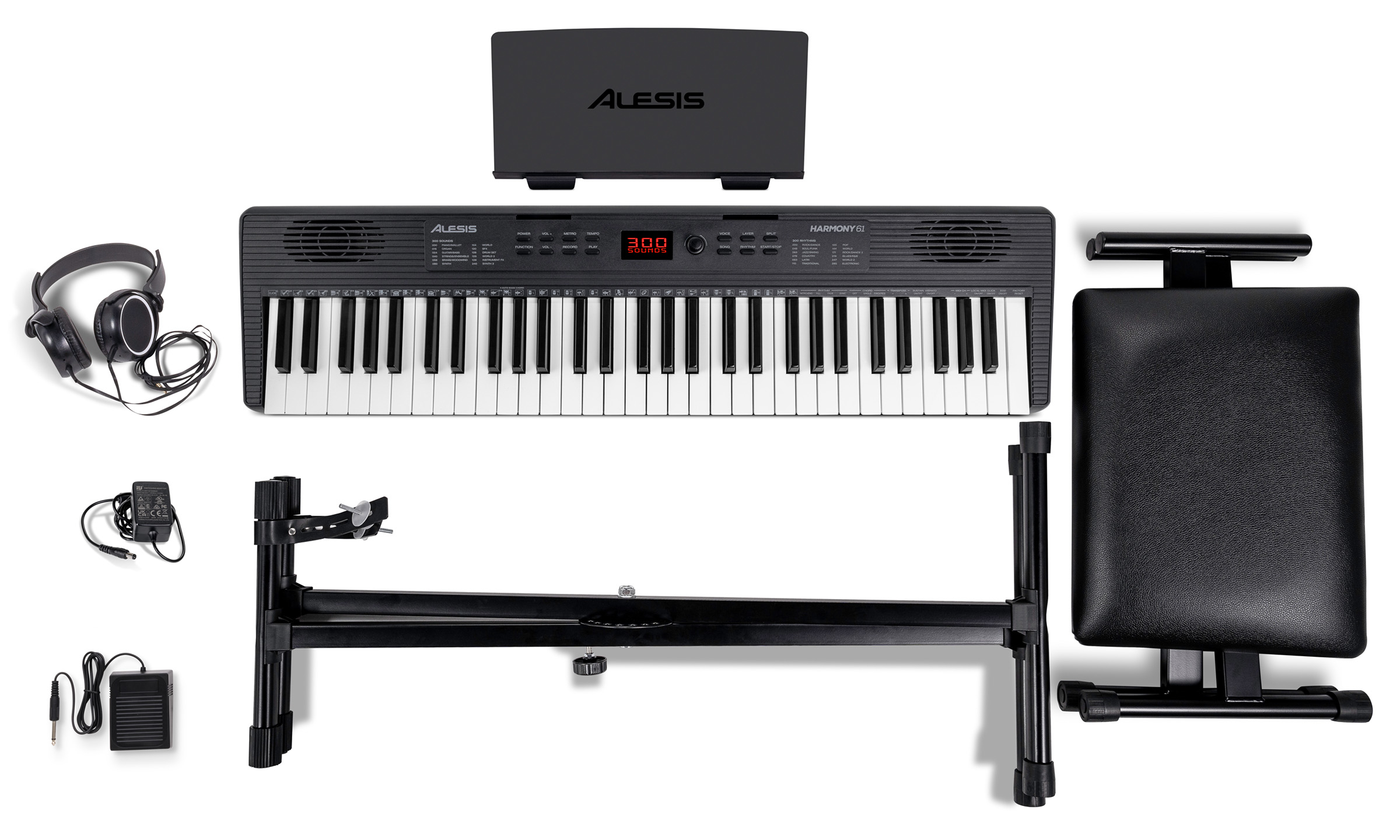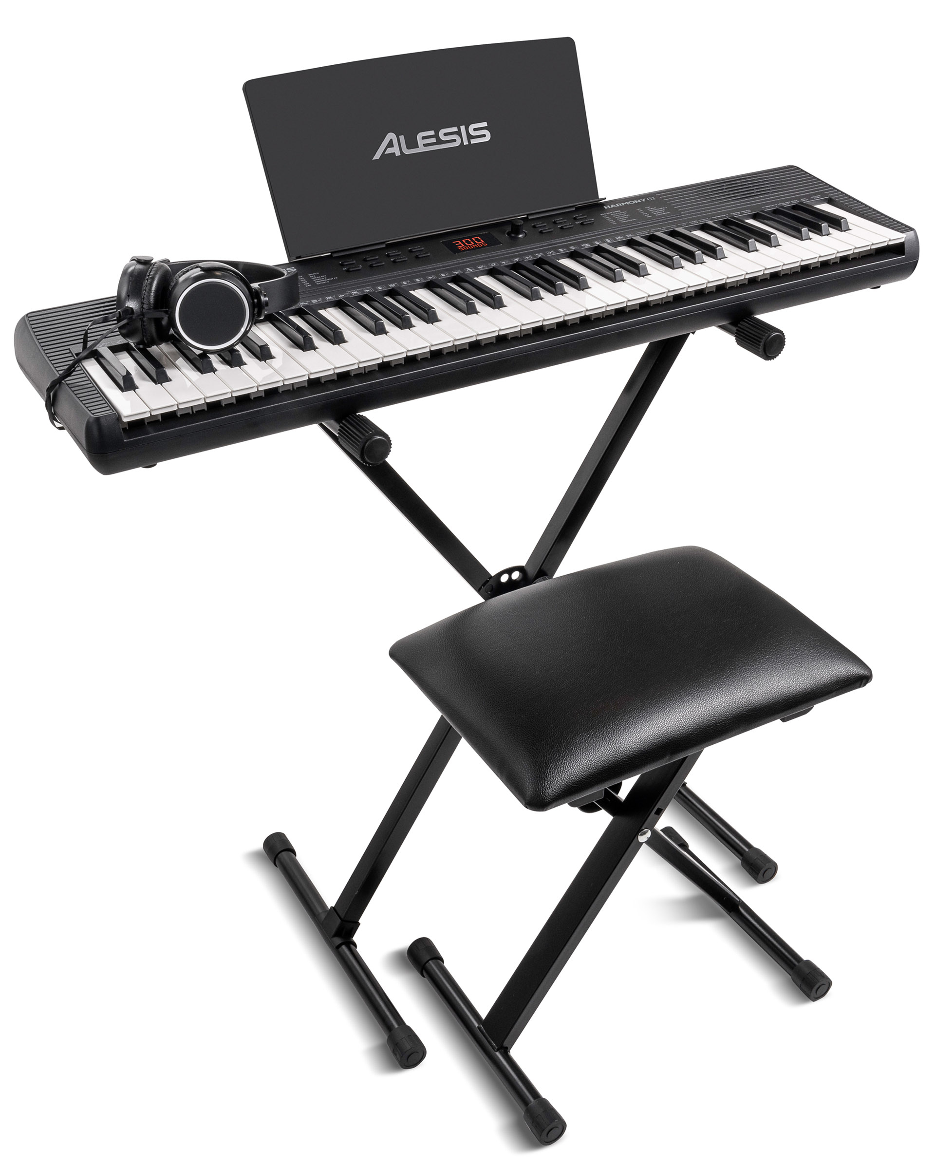 Sur le terrain, le Alesis Harmony 61 MK4 se distingue surtout par sa logique de pack complet. Le stand et la banquette réglable facilitent une position de jeu stable, et la présence du casque avec coupure automatique des haut-parleurs rend l’entraînement réellement flexible. Les 300 sons et 300 rythmes suffisent largement pour un débutant, et les fonctions split, layer et enregistrement apportent des outils concrets pour progresser sans complexité. Pour un usage familial, c’est un ensemble cohérent qui encourage la pratique régulière.