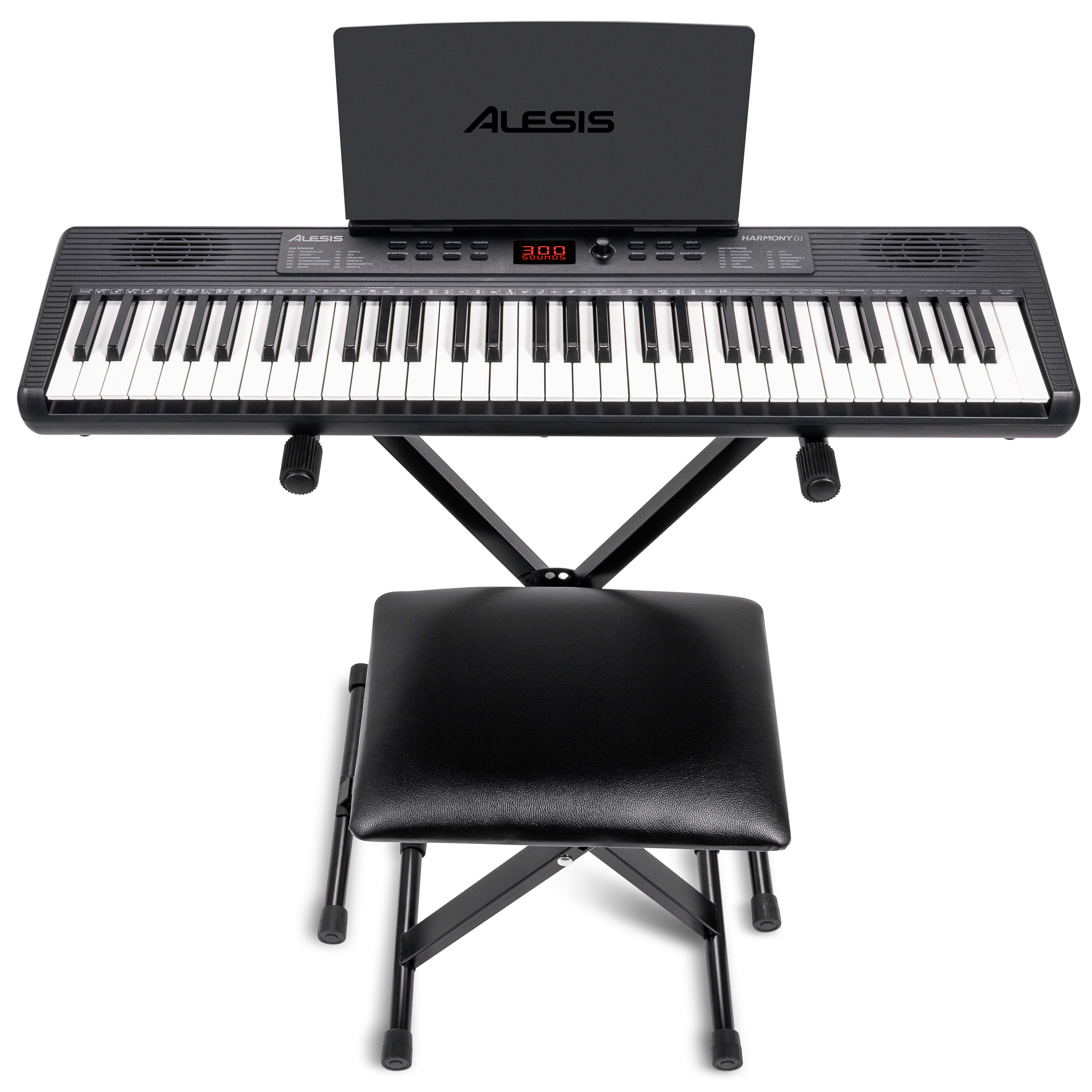 Le Alesis Harmony 61 MK4 est pensé comme un clavier arrangeur clé en main afin de limiter les freins au démarrage. Le stand stable se monte facilement et ses lanières contribuent à sécuriser l’installation du clavier à 61 touches, ce qui aide à conserver une position de jeu régulière. La banquette réglable complète l’ensemble pour adapter la hauteur de jeu aux enfants comme aux adultes, un point important pour la posture et le confort des poignets.