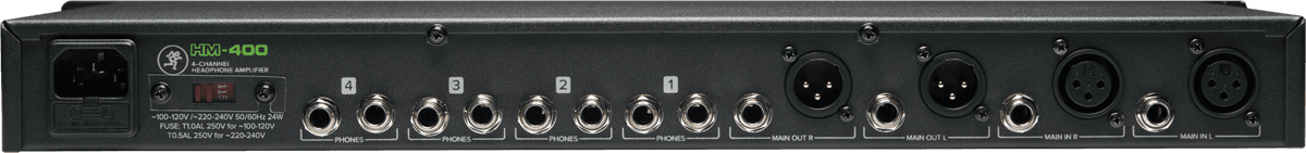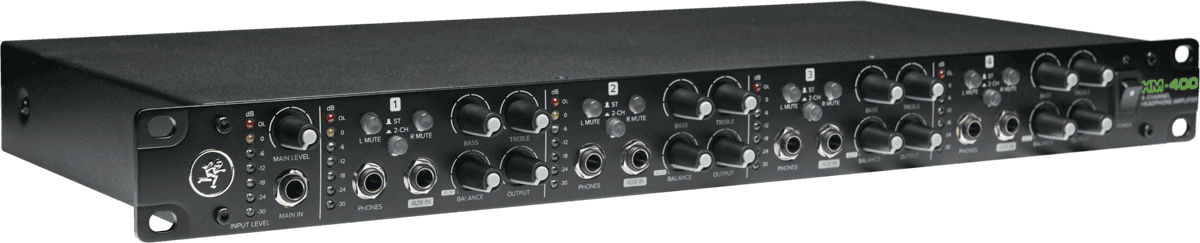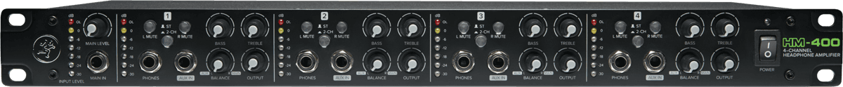Le Mackie HM-400 est un amplificateur casque rackable conçu pour les environnements professionnels. Il offre quatre canaux indépendants, chacun avec trois sorties casque, une entrée auxiliaire et des réglages précis pour le volume, la balance et l’égalisation grave/aiguë. Grâce à ses nombreuses entrées (jack et XLR) et à son égaliseur intégré par canal, il permet une distribution audio précise et personnalisable. Idéal pour les studios, répétitions ou installations fixes, ce préampli casque garantit une qualité sonore fiable et une gestion claire des signaux via des vumètres à LED. L'appareil est robuste, compatible avec un montage en rack 19 pouces, et inclut toutes les connectiques nécessaires pour un usage collectif professionnel.
