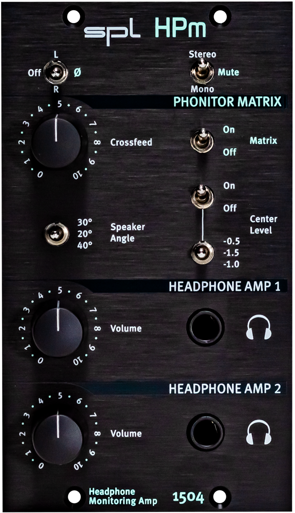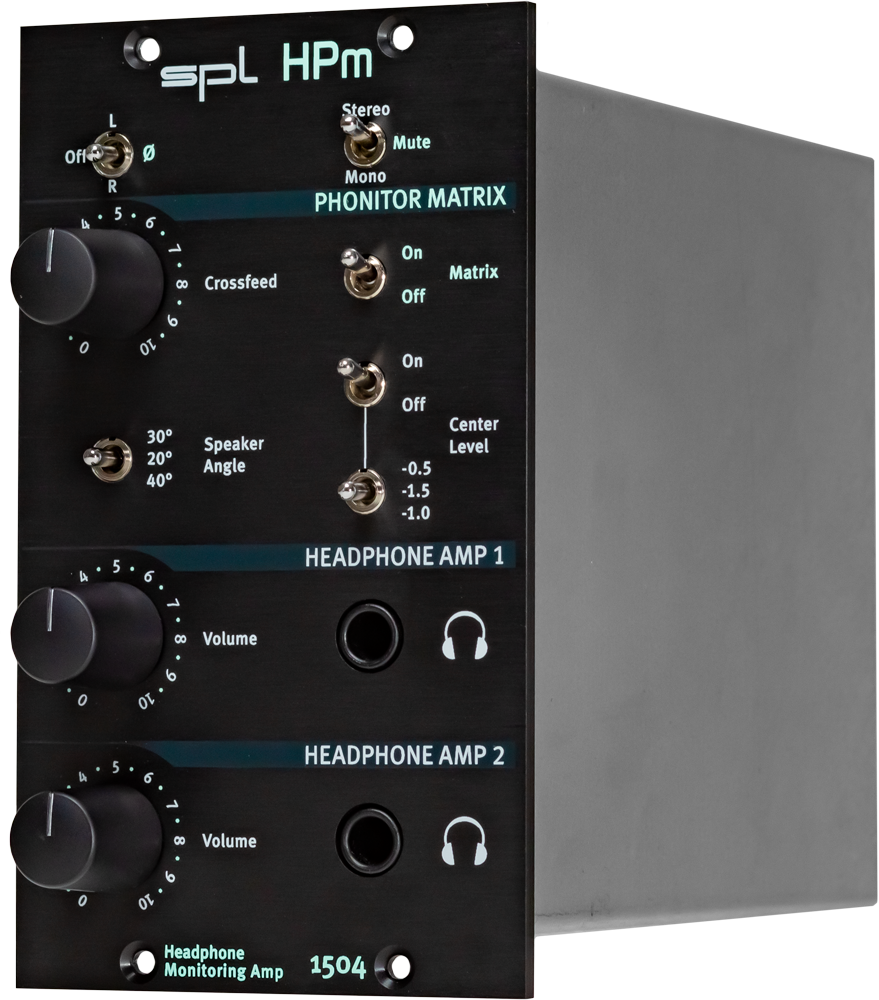 Le SPL HPm se distingue par l'intégration du Phonitor Matrix, une technologie analogique qui corrige l’image stéréo artificielle propre à l’écoute au casque. Cette fonctionnalité rend possible un mixage fidèle à la spatialisation d’un système d’enceintes. Grâce aux réglages de Crossfeed, Angle et Center Level, l’utilisateur adapte l’ouverture stéréo, l’angle des haut-parleurs virtuels et l’atténuation du centre.