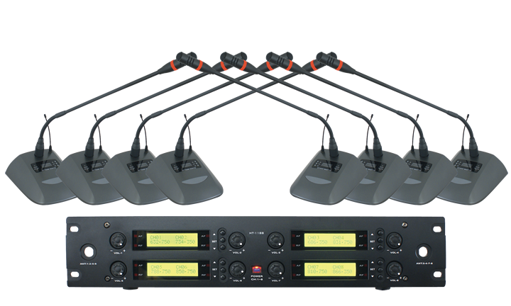 Ce système est un excellent choix pour les petites conférences mobiles ou bien fixe quand l'utilisation de câbles est compliquée ou impossible (8 micros pupitre maximum par récepteur). Sa conception lui permet de s'intégrer dans n'importe quelle salle de conférence. Vous avez la possibilité d'utiliser jusqu'à 4 récepteurs en même temps, c'est-à-dire 32 microphones pupitre simultanément sans interférences. En combinaison avec une table de mixage et / ou une matrice, vous disposerez d'un petit système de conférence performant à moindre cout. Ce petit système peut être aussi utilisé dans des magasins ou des supermarchés (pupitre à chaque caisse pour appeler).