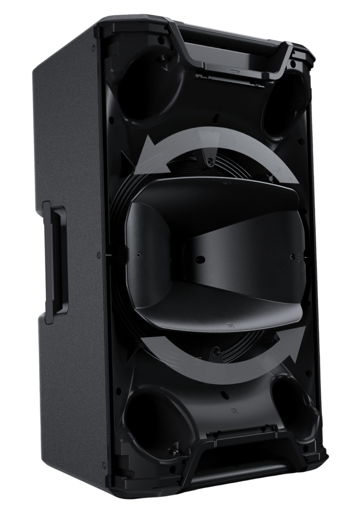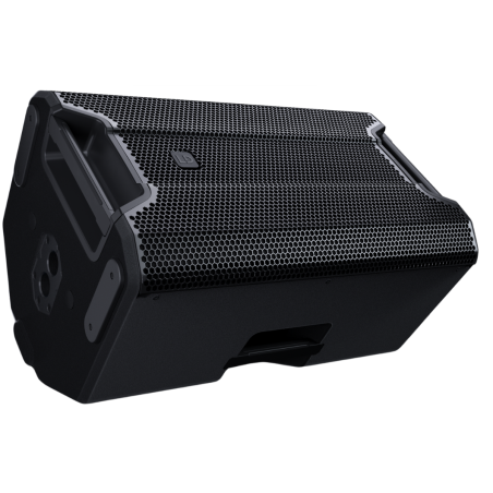 Quatre poignées ergonomiques sont intégrées dans le châssis, facilitant le transport et l’installation. L’enceinte peut être utilisée en position verticale ou inclinée (50°) pour un usage en retour de scène. Elle est aussi compatible avec un pied standard de 35 mm, avec double inclinaison (0° ou 5°) pour une orientation sonore adaptée.