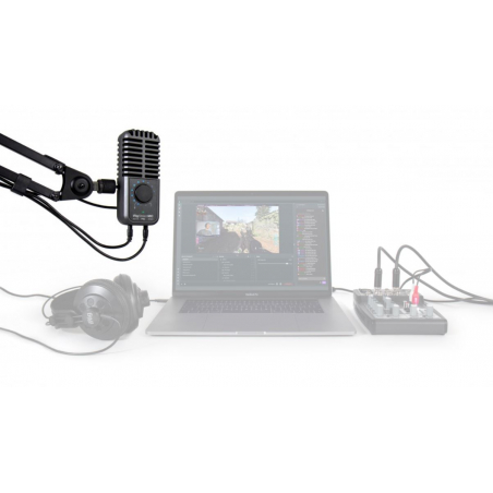 Connectez lecteurs multimédias, claviers, tables de mixage, platines, consoles et autres à une entrée audio stéréo pratique de 3,5 mm directement dans le micro. Grâce à sa commande de mix de monitoring, vous pouvez mixer l'audio direct ou enregistré via la sortie casque. Désormais, conservez l'ensemble de votre installation dans un design élégant et compact à emporter partout.
