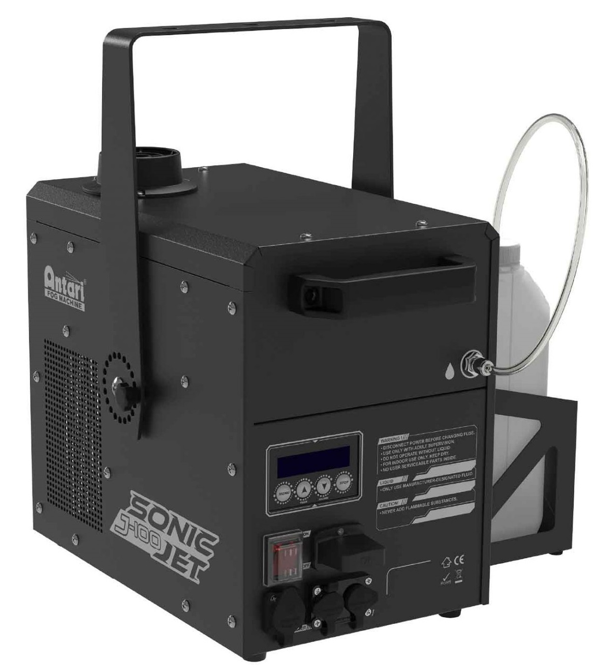 Grâce à un réservoir de 4 litres et une consommation de fluide maîtrisée à 250 mL/min à pleine puissance, l’Antari J-100 Sonic Jet assure une autonomie appréciable. Cela permet d’éviter des interruptions fréquentes pour le remplissage pendant les shows.