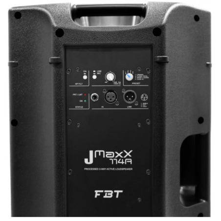 FBT J MAxX 114A, enceinte bi-amplifiée de 900 watts RMS, haut parleur de 14" (35,5cm) et moteur 1" avec DSP 4 programmes d'égalisations. Utilisable en façade, en installation et retour de scène.