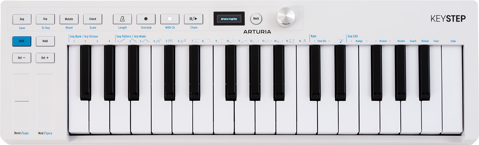 Le KeyStep MK2 dispose de commandes de transport intégrées, facilitant l’enregistrement et la lecture sans passer par un DAW. Son écran OLED apporte une lisibilité immédiate des paramètres et des séquences en cours. Les bandes tactiles permettent un contrôle précis et silencieux du pitch et de la modulation.