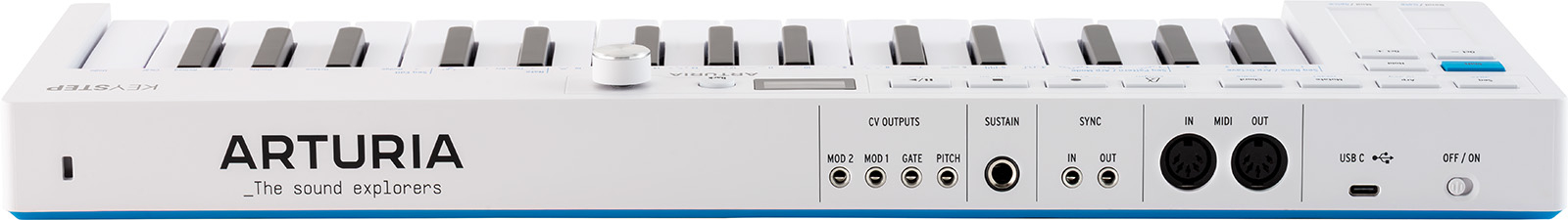 L’Arturia KeyStep MK2 offre une connectique complète pensée pour les environnements hybrides. Il dispose de ports USB-C, MIDI DIN, CV/Gate et Sync I/O (3,5 mm), ainsi qu’une entrée pour pédale de sustain. Cette polyvalence permet de l’intégrer aussi bien à des synthétiseurs logiciels qu’à des systèmes analogiques modulaires.