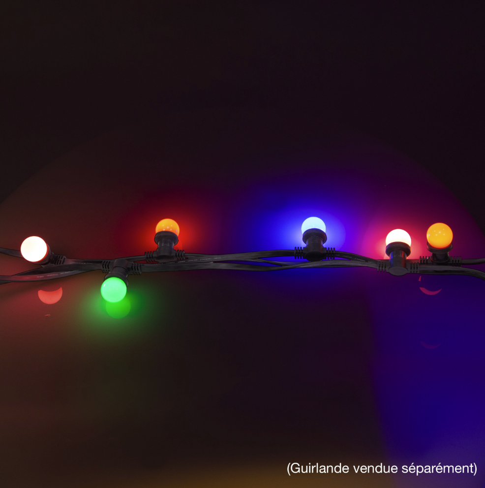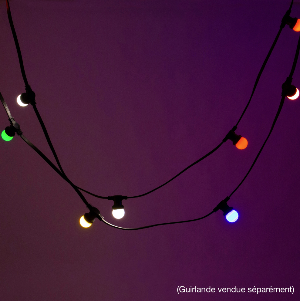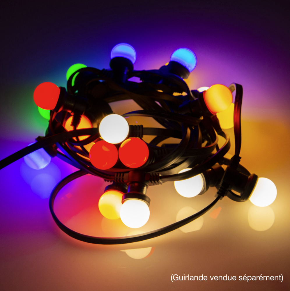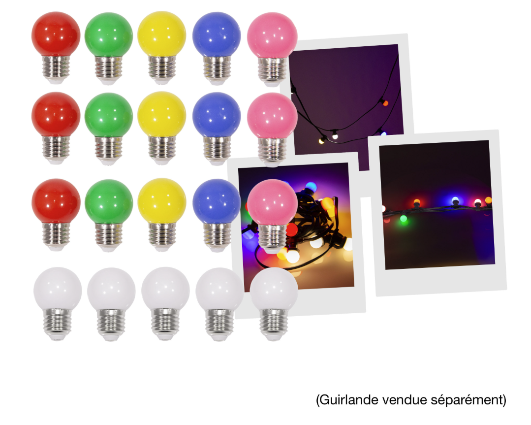 Le pack LAMP-20COL utilise une douille E27, le format le plus courant pour les ampoules LED. Cela facilite leur installation sur des guirlandes et supports compatibles sans adaptateur supplémentaire.