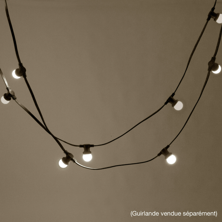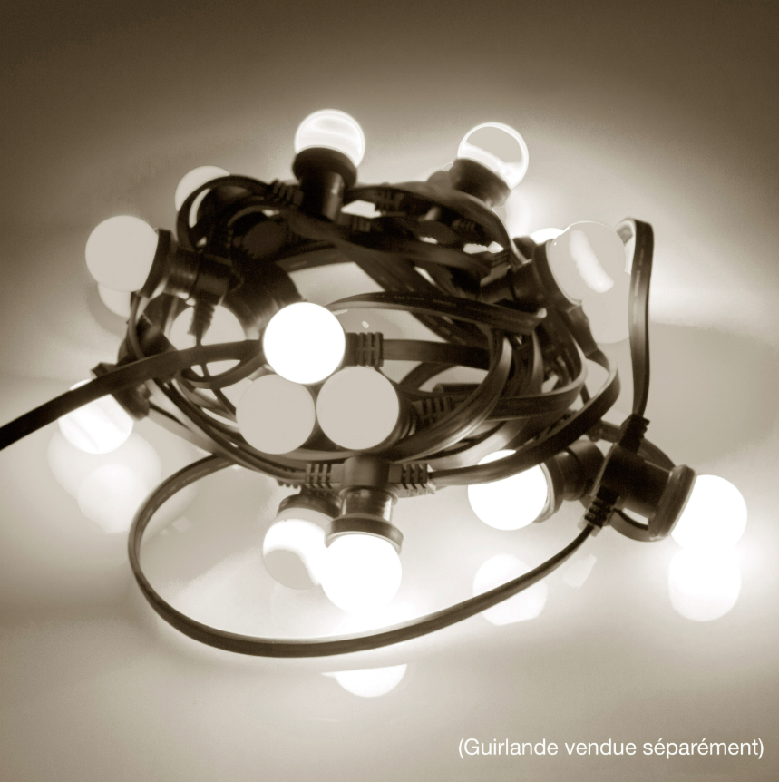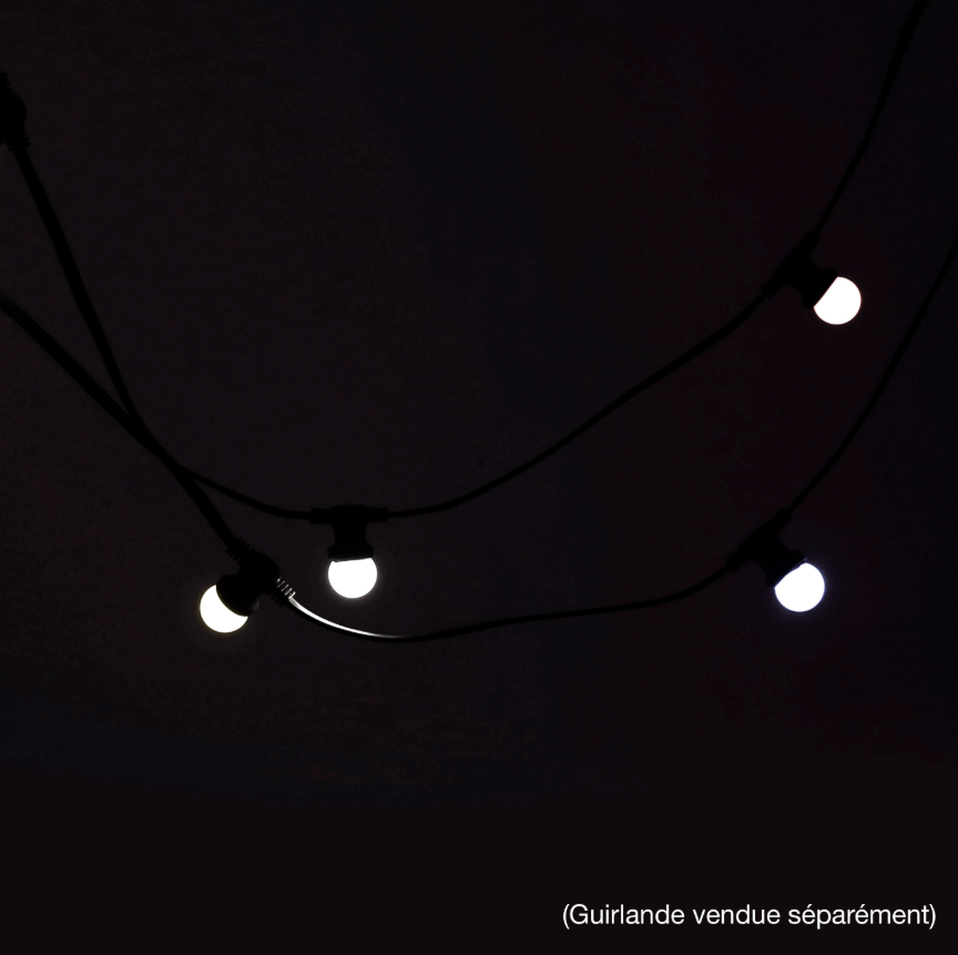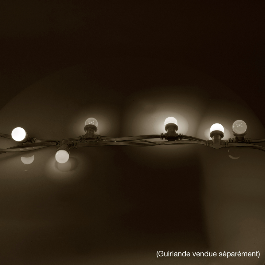 Il suffit de visser chaque ampoule LED sur un culot E27 compatible. Aucune configuration électrique spécifique n’est requise. Elles sont prévues pour fonctionner sur la guirlande Mac Mah SL20-10M IP ou toute installation équipée en E27 sur 220-240 V.