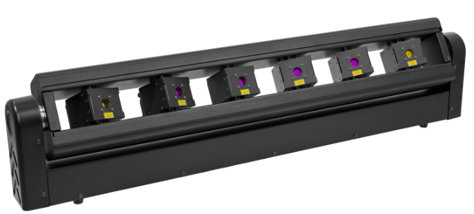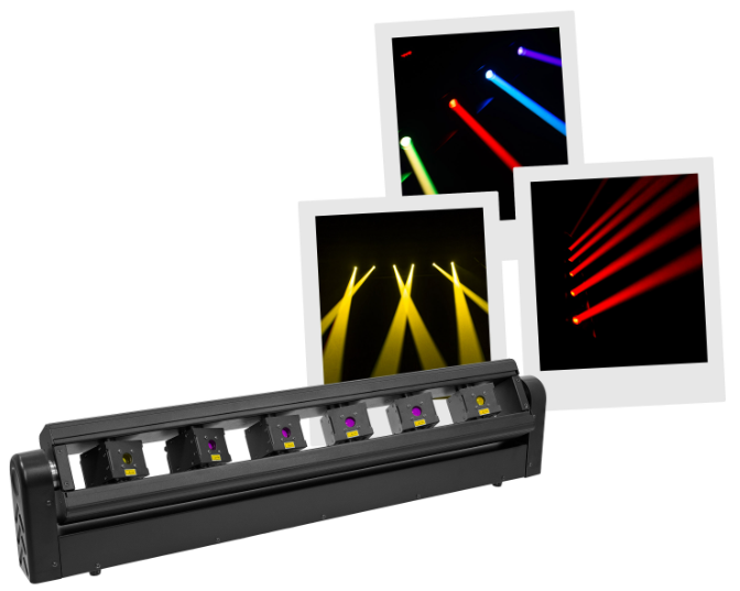 Avec ses six faisceaux RGB motorisés, la barre peut créer des effets en éventail, des balayages synchronisés, des lignes parallèles et bien plus. L’effet est renforcé en présence de fumée, rendant les faisceaux visibles dans l’espace. La modulation TTL permet une bonne précision dans les transitions de couleurs et formes.
