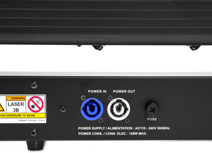 Le LASER Bar 6X400RGB est équipé d'une connectique PowerCON, standard dans le secteur professionnel pour sa fiabilité et sa sécurité. Cela facilite l'intégration dans des installations scéniques et permet un chaînage électrique sécurisé entre plusieurs appareils.