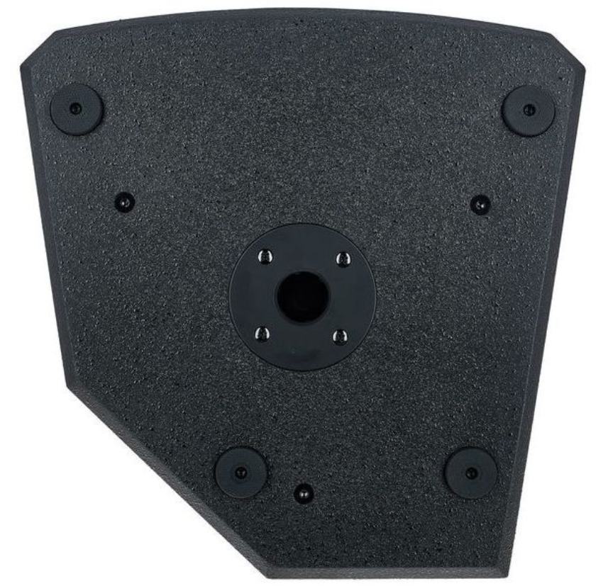 L’embase standard permet l’installation sur des pieds d’enceintes classiques. Les inserts M8 autorisent la suspension sécurisée sur structures, portiques ou murs, répondant aux besoins des installations fixes dans les lieux publics.