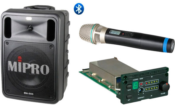 Le MA505 peut être complété par plusieurs accessoires Mipro : lecteur CD USB (8CD0036), lecteur/enregistreur SD+USB (DPM-3), émetteur MTM-91 pour relier plusieurs enceintes, ou encore des récepteurs numériques (MRM-24, MRM-58). Ces modules s’insèrent directement dans le boîtier pour étendre les fonctionnalités.