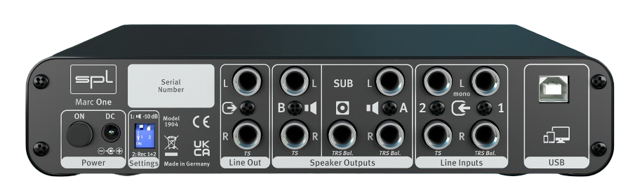 Le SPL Marc One prend en charge une résolution jusqu’à 32-bit / 768 kHz en PCM et jusqu’à DSD256 (11,2 MHz) en DoP. Cela permet des enregistrements et écoutes en très haute fidélité, adaptés aux exigences du mastering et aux applications audiophiles.