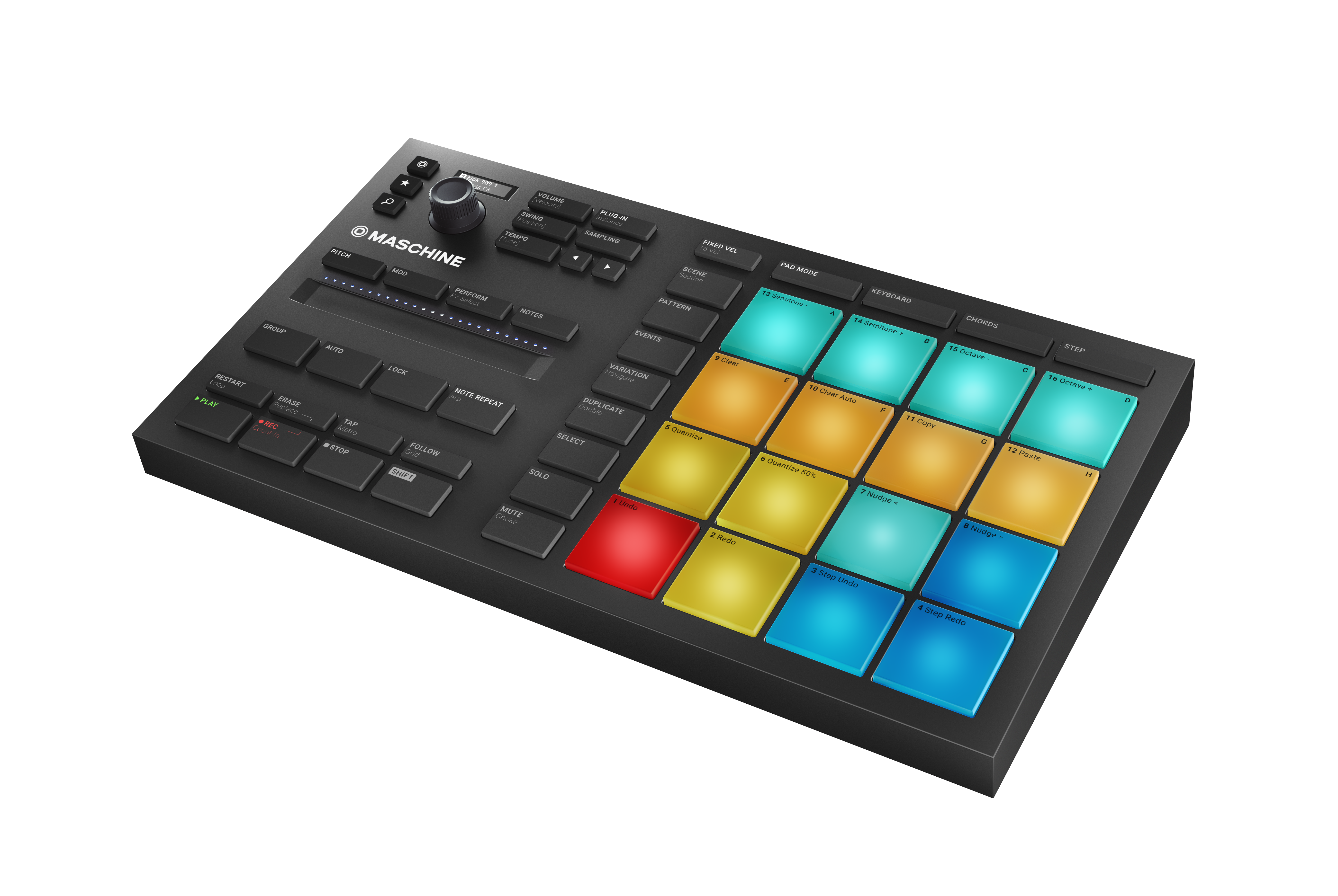 Les 16 pads tactiles du MASCHINE MIKRO MK3 offrent une sensibilité exceptionnelle pour composer des rythmes précis et expressifs. Leur conception permet un finger drumming intuitif, idéal pour les musiciens qui aiment jouer directement sur le contrôleur.