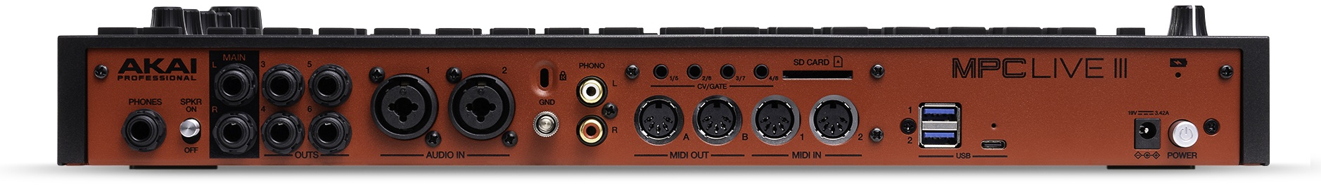 L’Akai MPC Live III s’adapte parfaitement à tout environnement grâce à sa connectique étendue : USB-C, MIDI In/Out, CV/Gate, entrées/sorties audio TRS, RCA et casque. Cette flexibilité permet une intégration fluide dans une configuration studio, un setup modulaire ou un rig de scène.