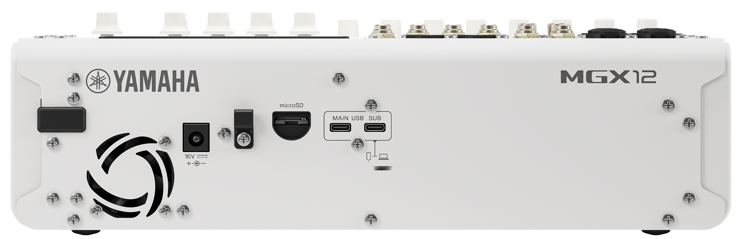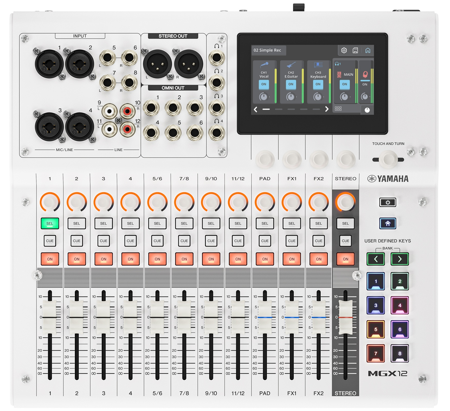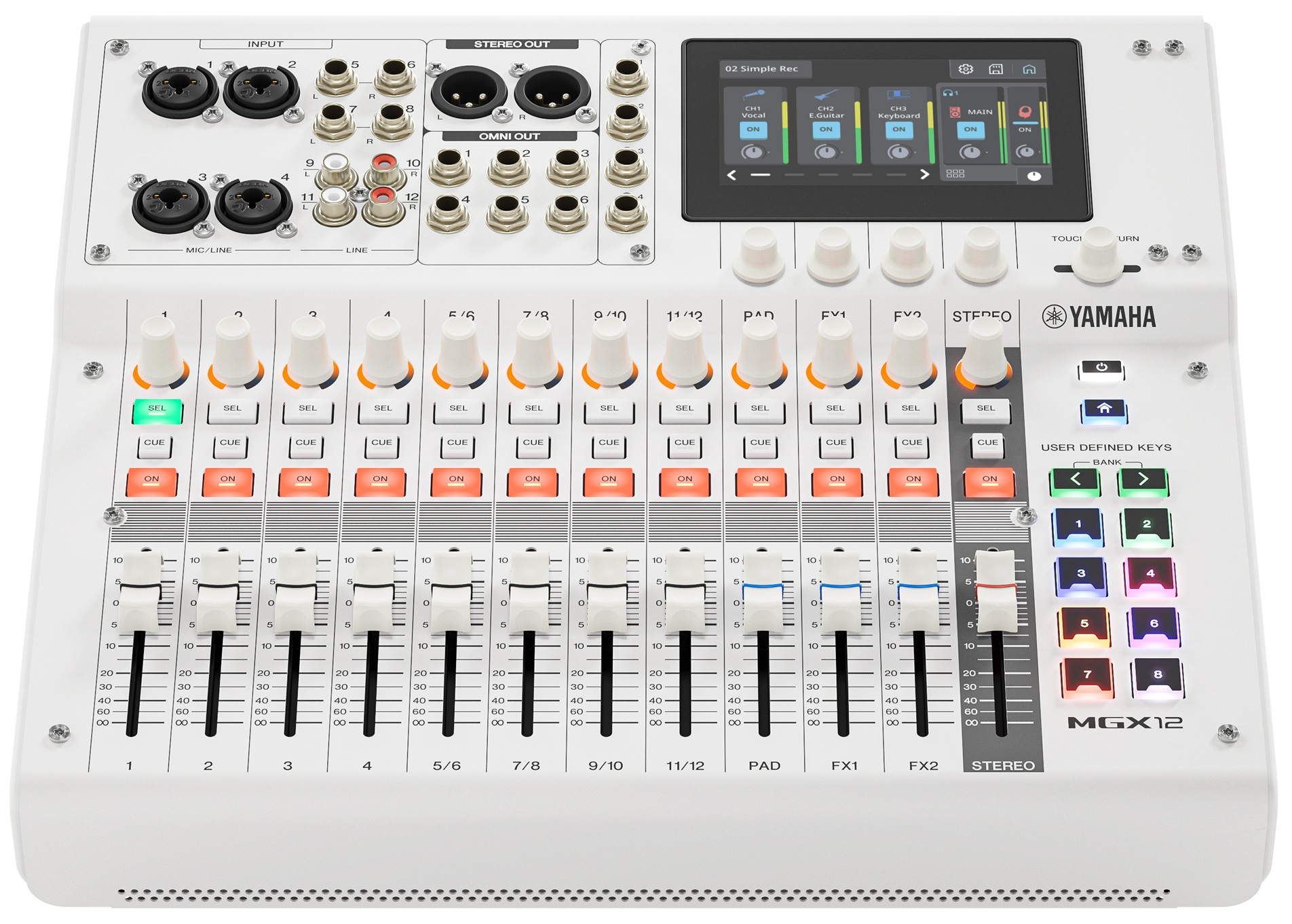 Grâce à ses huit pads multifonctions et ses quatre encodeurs assignables sur quatre banques, la Yamaha MGX12 W offre un haut niveau de personnalisation. Ces contrôles peuvent être affectés à diverses fonctions : effets, raccourcis, gestion de scène ou réglages de niveaux. Cela permet d’optimiser chaque workflow en fonction de l’application ou des préférences utilisateur.