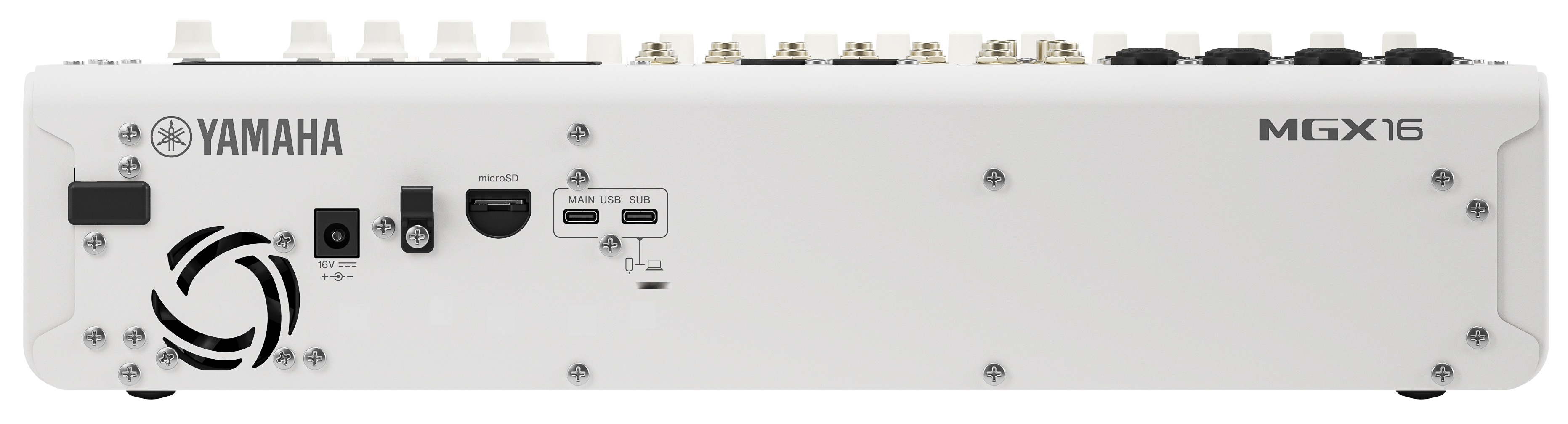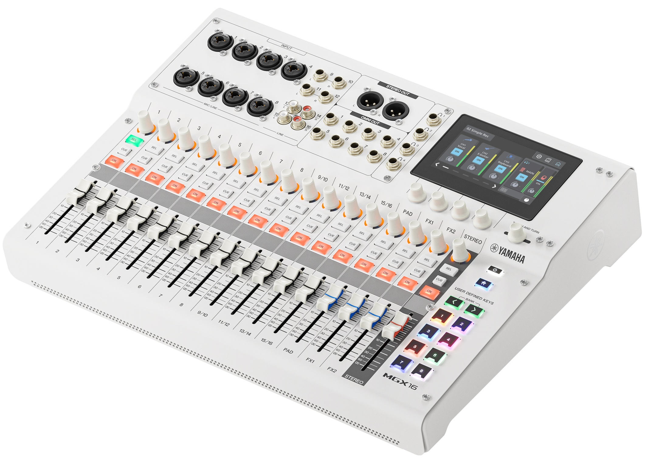 La console Yamaha MGX16 W intègre de puissants effets numériques, dont EQ, compresseur, reverb, simulateur d’ampli et voice changer. Elle propose également la fonction Total FX qui inclut des outils comme le Ducker et un compresseur multibande, permettant un traitement audio avancé directement depuis la console, sans nécessiter d’équipements externes.
