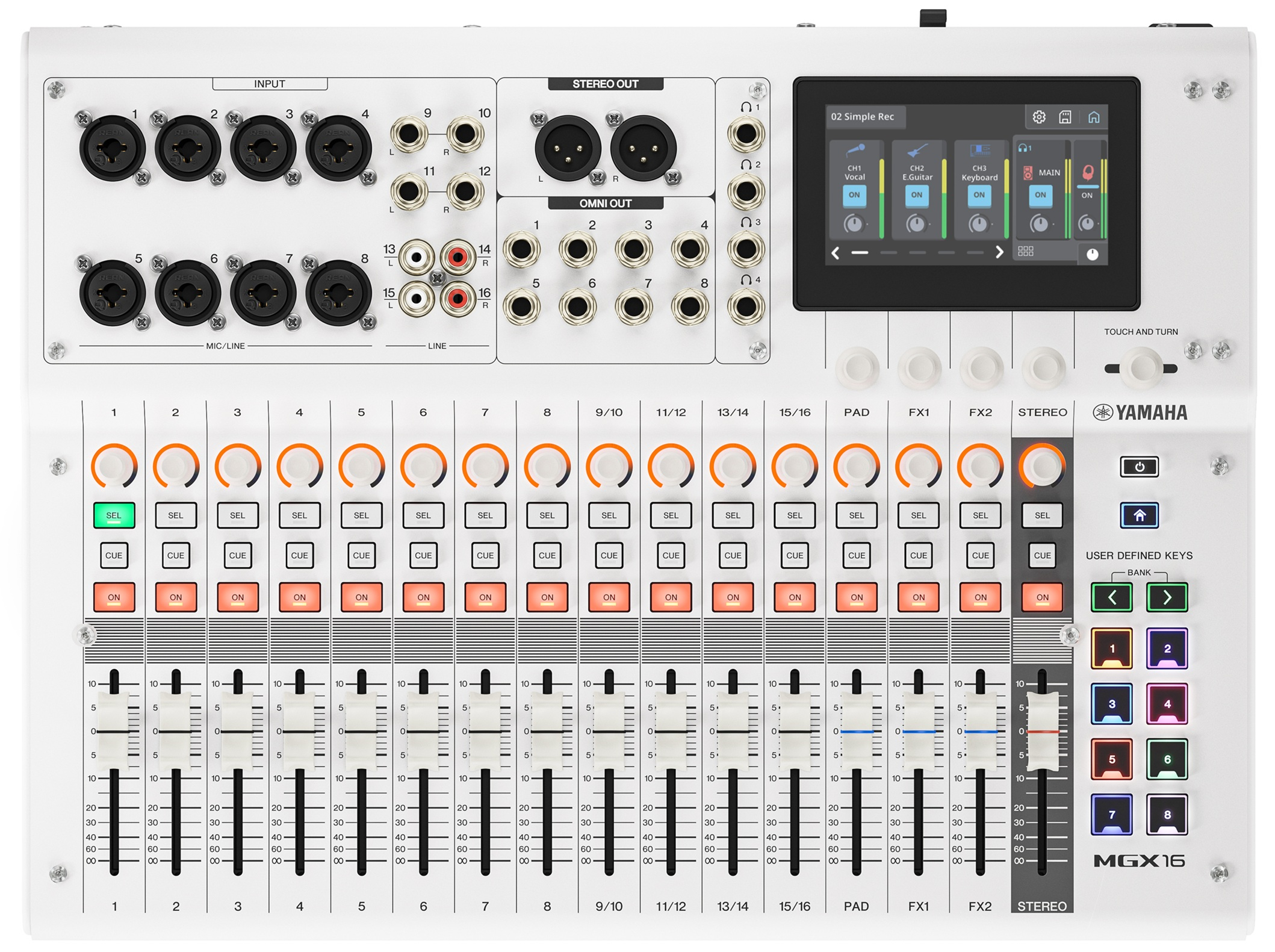 La Yamaha MGX16 W offre une prise en main optimale grâce à ses 16 faders de 60 mm et son écran LCD tactile intuitif. Le contrôle Touch & Turn combiné aux quatre encodeurs personnalisables permet d’accéder rapidement aux paramètres essentiels. Que ce soit en live, en studio ou en streaming, ce système assure un contrôle détaillé du mixage audio.