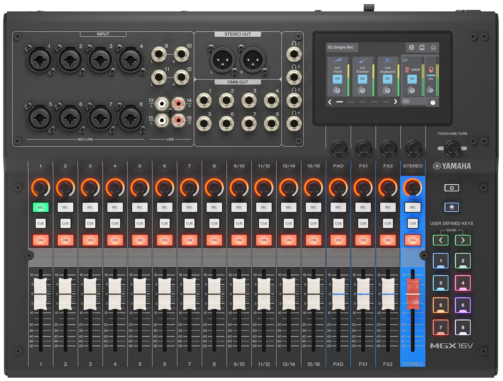 La console MGX16V B intègre une interface tactile intuitive permettant un accès direct aux paramètres essentiels. Grâce à l'écran LCD et à la fonction Touch & Turn, les utilisateurs peuvent ajuster les effets, niveaux, EQ et routages en temps réel, offrant une réactivité adaptée aux environnements professionnels. Le contrôle devient fluide, précis et entièrement personnalisable.