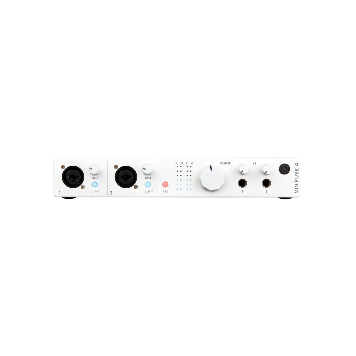 Interface Audio MINIFUSE4 blanc de chez ARTURIA . Fréquence d'échantillonnage de 192 kHz, USB 2.0, USB-C, le MINIFUSE4 est parfait pour enregistrer vos voix, podcast et instrument. Portable, il vous accompagnera partout !