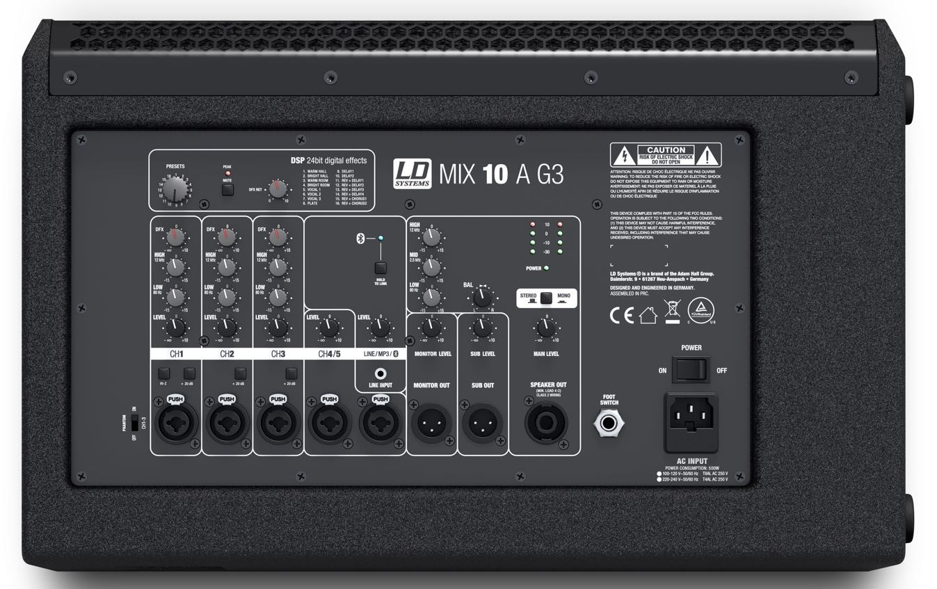 Accueillant une grande variété de sources d'entrée, notamment les instruments électriques, smartphones, tablettes, lecteurs MP3 et CD, la table de mixage intégrée offre 3 canaux de microphone avec égaliseur à 2 bandes, une alimentation fantôme 48 V plus une entrée hi-Z commutable (CH1) et un canal de ligne stéréo. La section de sortie comprend un égaliseur principal à 3 bandes pour la mise en forme globale du son, un indicateur LED à 4 segments et des sorties XLR pour moniteur et caisson de basses. En outre, le LD MIX 10 A G3 est doté d'un DSP avec 16 préréglages d'effets, un limiteur et une protection contre les surintensités, les surcharges, les courts-circuits et la chaleur. Une sortie speakON permet d'alimenter le LD MIX 10 G3 passif pour créer facilement une configuration stéréo.