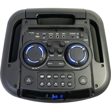 Sources d’entrée : Bluetooth, USB, microSD, AUX, 1 entrée Guitare et 2 entrées Micro