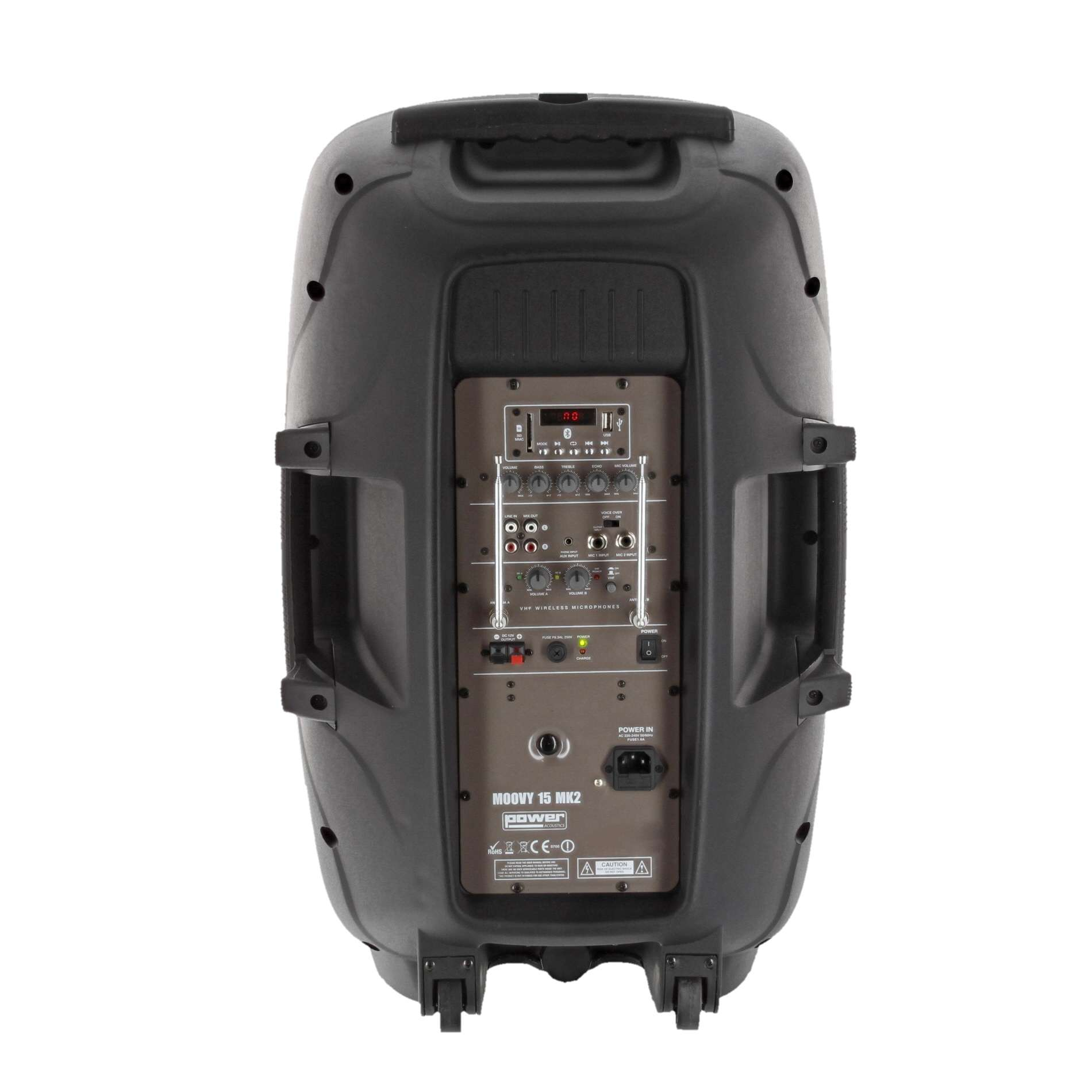 MOOVY 15 MK2 Power Acoustics, nouvelle version de la gamme de sono portable Power. La MOOVY 15 MK 2 Power est une enceinte sono portable fonctionnant sur batteries / secteur. La MOOVY 15 MK2 Power développe une puissance de 90W RMS. Elle est équipée d'un lecteur USB, micro SD, d'un micro HF main et d'un micro HF serre-tête. MOOVY 15 MK2 est équipée d'un récepteur Bluetooth. Elle est également équipée d'un trolley pour le transport et la manipulation.