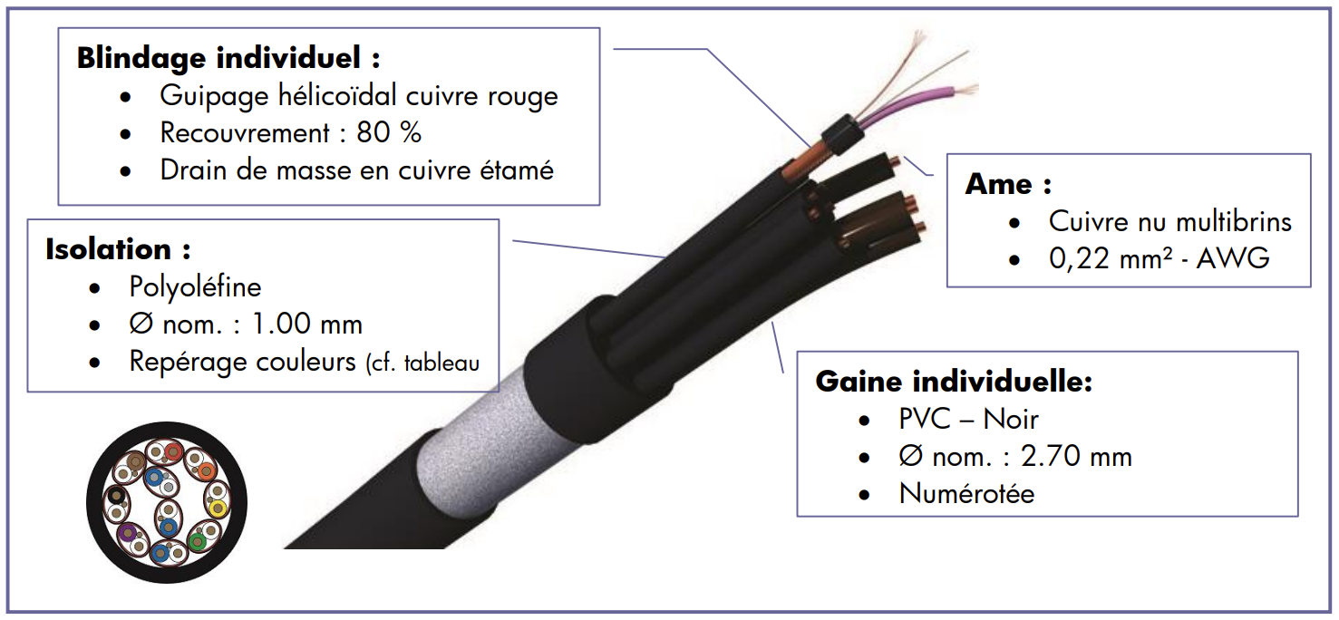 Le blindage individuel de chaque paire limite les interférences électromagnétiques et les diaphonies entre lignes. Sur le CAE MPAP2, le guipage cuivre à 80 % assure une protection efficace, essentielle pour préserver la qualité du signal audio analogique.