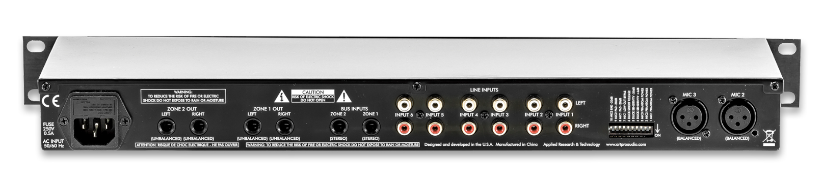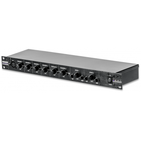 Le premier canal peut être utilisé pour contrôler, via un commutateur en façade, une fonction d'atténuation pour tous les autres canaux, ce qui en fait une solution idéale pour les systèmes de radiomessagerie. Les six canaux peuvent accepter des signaux de niveau ligne stéréo asymétriques. L'alimentation fantôme 48v peut être assignée indépendamment pour chaque canal micro. Chaque canal dispose de commandes de niveau indépendantes et peut être acheminé indépendamment vers l'une ou l'autre sortie de zone, les deux ou aucune. Des commandes de niveau, de basses et d'aigus séparées permettent de régler le son de chaque sortie de zone. Deux entrées de bus permettent de raccorder plusieurs unités lorsqu'un plus grand nombre de canaux d'entrée est nécessaire.