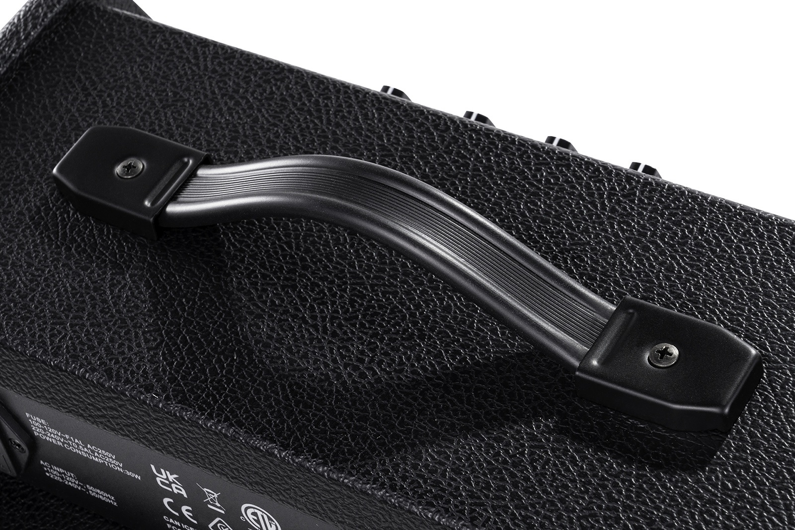 L’ampli dispose d’un égaliseur 2 bandes (basses et aigus) en façade, d’un contrôle de volume principal et d’un réglage séparé pour le Bluetooth. Ces commandes simples permettent d’ajuster rapidement votre mix en fonction de votre jeu ou de l’environnement.