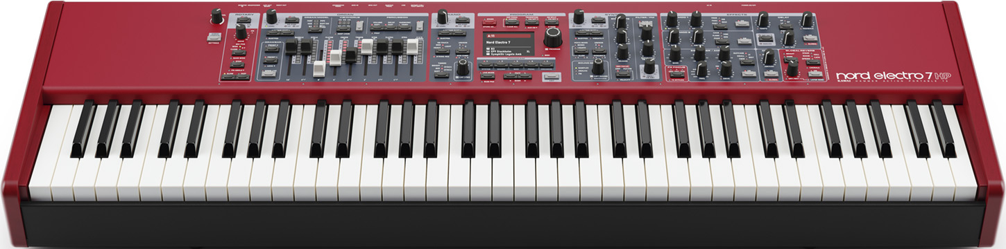 Le Nord Electro 7 HP apporte un écran couleur, une section synthé plus complète (FM, filtres, enveloppes), un split avancé avec LED, des effets par module et la modélisation d’orgue du Nord Organ 3. La navigation a aussi été simplifiée.