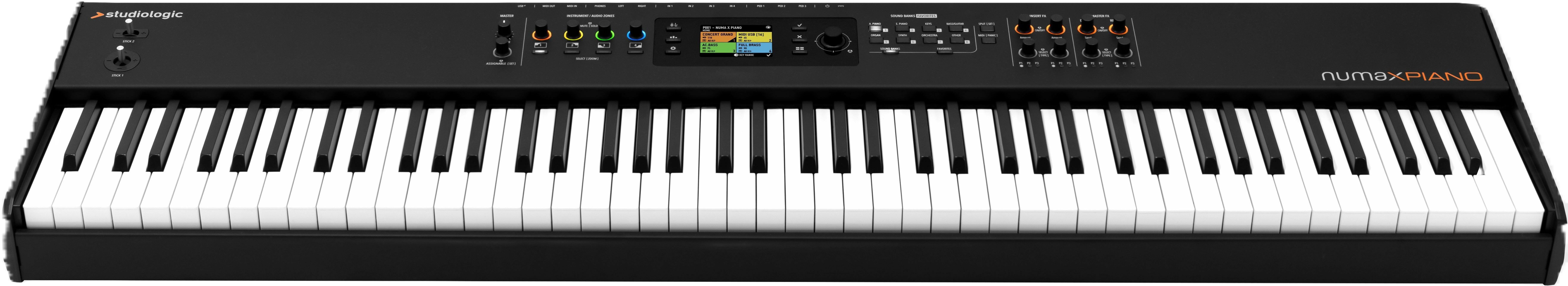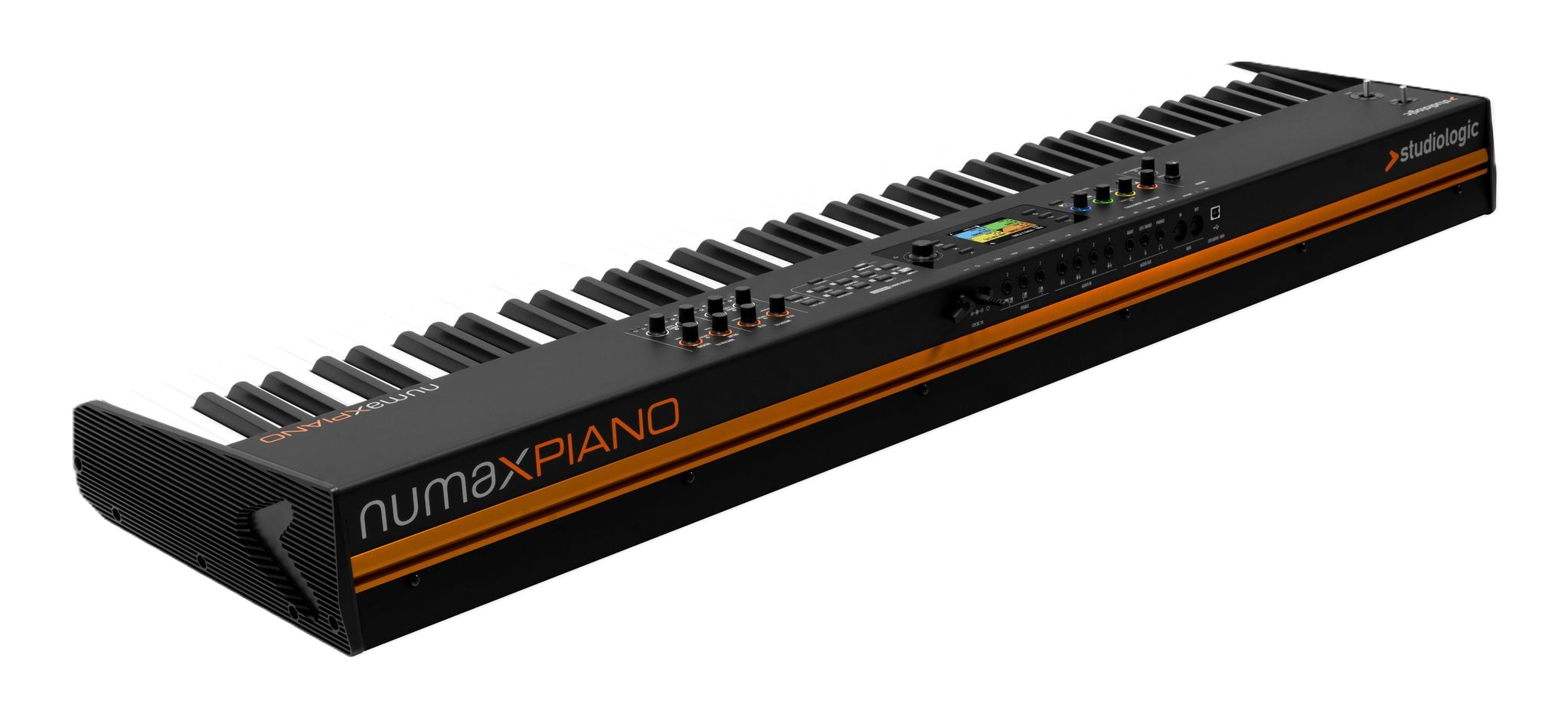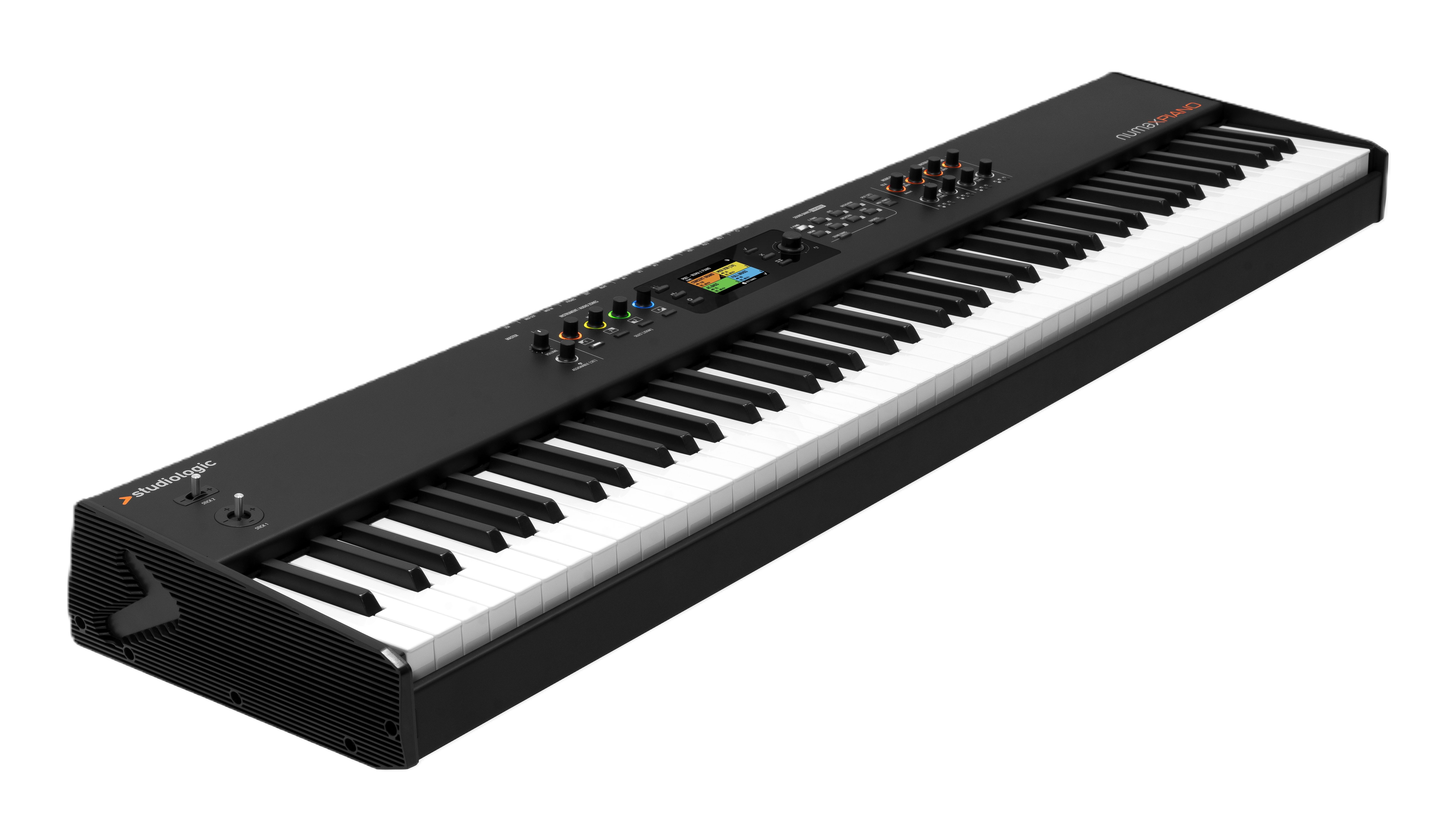 L’interface du Studiologic Numa X Piano 88 a été pensée pour une utilisation directe et efficace sur scène. L’écran couleur TFT de 2,8 pouces affiche clairement les paramètres essentiels, tandis que les encodeurs adaptatifs changent de couleur selon la fonction sélectionnée. Cette logique visuelle réduit le temps de réglage et limite les erreurs en conditions de jeu.