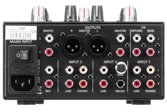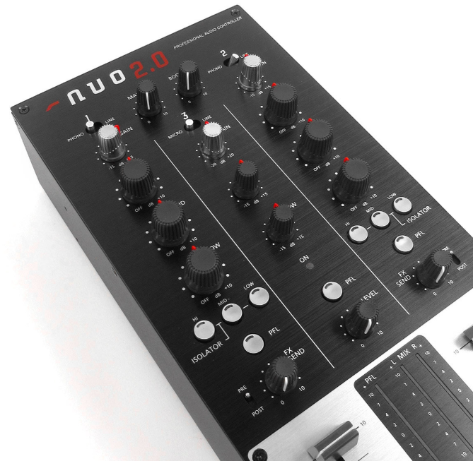La NUO 2.0 dispose de 2 entrées PHONO, 3 entrées LINE et 1 entrée MICRO/LINE, offrant une flexibilité maximale pour connecter platines, lecteurs ou micros. Elle est idéale pour toutes les configurations DJ.