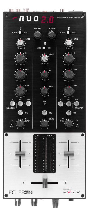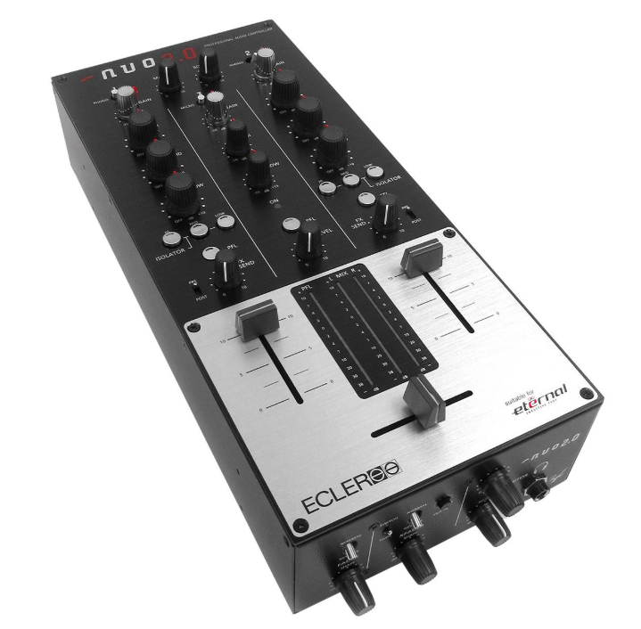 La Ecler DJ NUO 2.0 est une table de mixage analogique 2+1 voies stéréo, conçue pour les DJs professionnels de tous styles. Dotée d’un égaliseur 3 bandes à coupure totale, de commandes FX pré/post-fader, de faders VCA 45 mm longue durée et de réglages de courbe, elle garantit une précision optimale. Sa compatibilité avec le crossfader magnétique ETERNAL la rend idéale pour le scratch. Avec ses sorties symétriques XLR, ses entrées multiples et sa fabrication haut de gamme à Barcelone, la NUO 2.0 s’impose comme une référence pour clubs, événements mobiles et studios.