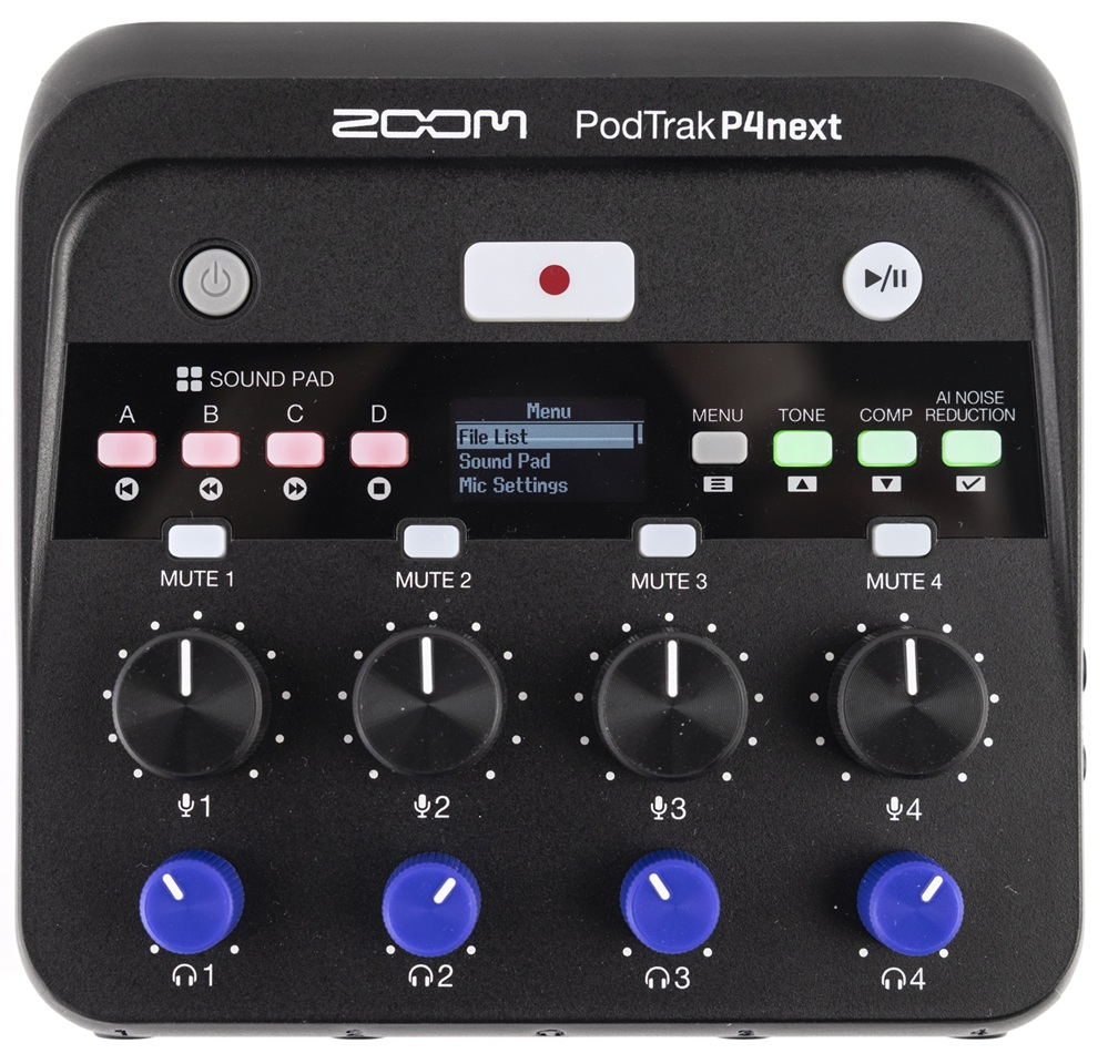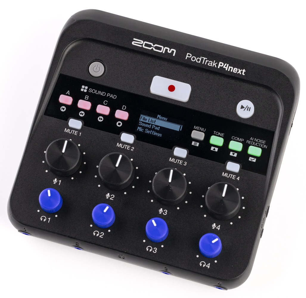 Le Zoom P4next est une interface audio portable dédiée au podcast. Compact et puissant, il intègre une réduction du bruit assistée par intelligence artificielle, un égaliseur, un dé-esseur et un compresseur pour un son clair et professionnel. Il offre 4 entrées XLR avec alimentation fantôme 48 V, 4 sorties casque indépendantes, et permet d’enregistrer en stéréo ou multipiste jusqu’à 2 To sur carte SD. Grâce à ses connexions USB, TRRS ou Bluetooth (avec BTA-2), il accueille jusqu'à deux invités à distance. Parfait pour les podcasteurs mobiles ou en studio.