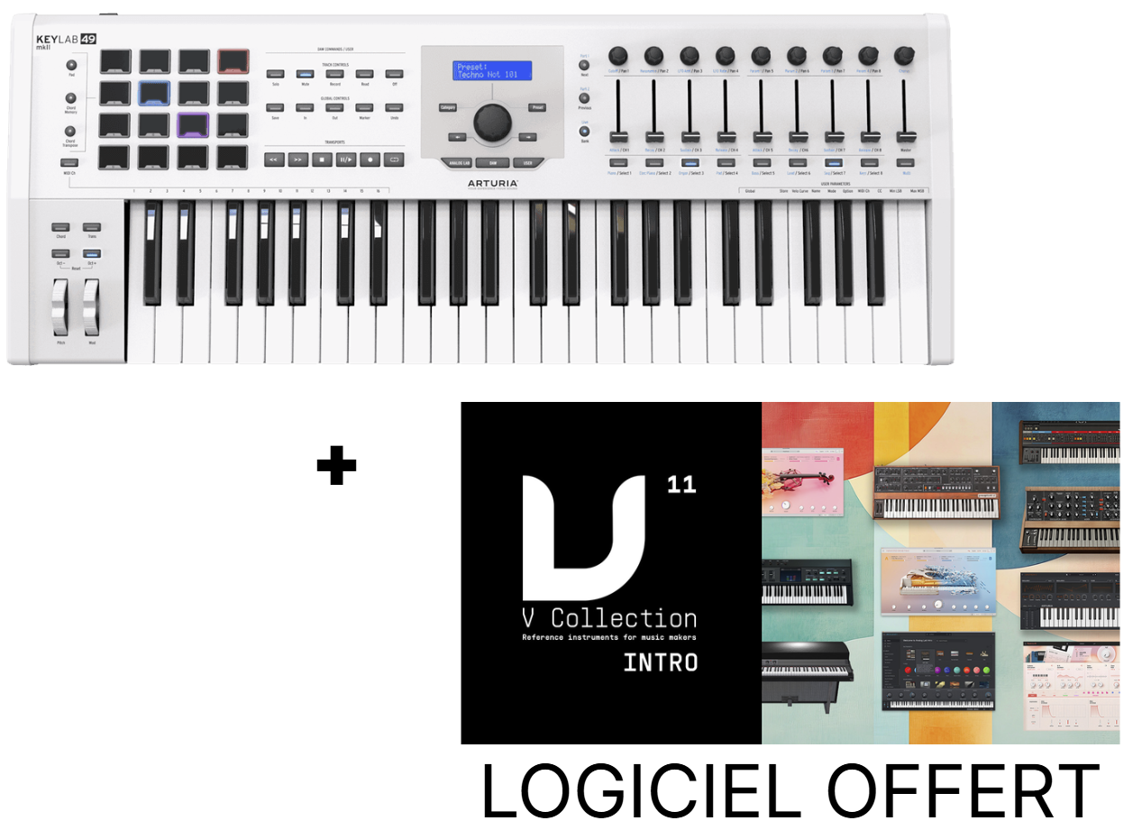 Le Pack KeyLab MkII 49 White + V-Collection 11 Intro est un contrôleur MIDI professionnel Arturia, combinant un clavier maître haut de gamme 49 touches avec une suite de 10 instruments virtuels iconiques. Grâce à son châssis aluminium, ses pads RGB, son interface complète et sa connectivité avancée (CV, MIDI, USB), il s’adresse aux musiciens exigeants en quête de contrôle total. La V-Collection 11 Intro offre une palette sonore exceptionnelle, du vintage analogique à la synthèse FM moderne. Un duo incontournable pour créer, produire et performer avec expressivité, précision et plaisir.