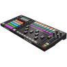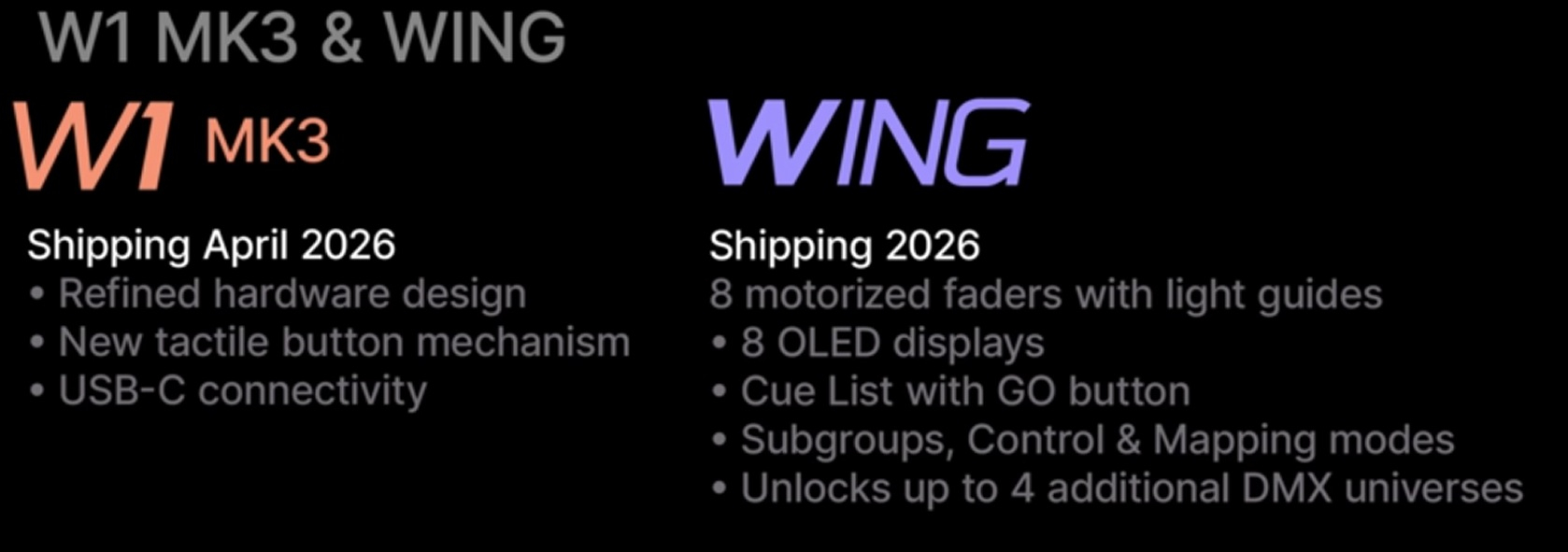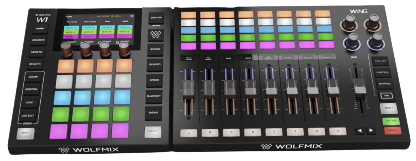 Le Wolfmix Wing apporte une surface de contrôle physique complète avec faders motorisés, pads RGB et écrans OLED. Cette ergonomie rappelle les consoles lumière traditionnelles, facilitant la prise en main pour les professionnels.