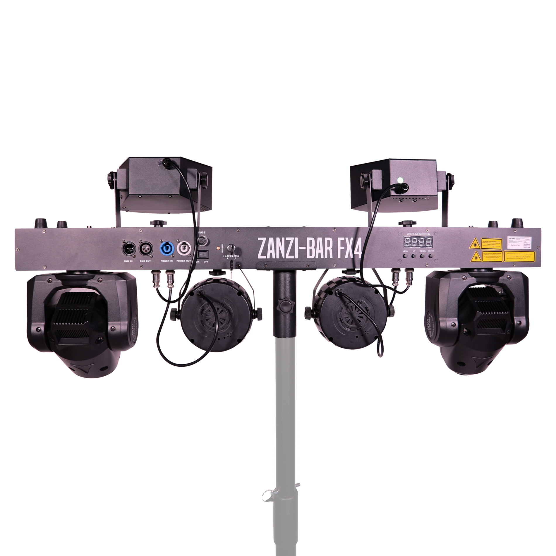 Les différentes sources de lumière de la barre – y compris les lyres spot, les lasers et les stroboscopes – assurent une diffusion lumineuse complète et homogène. Avec des effets puissants et colorés, la ZANZI-BAR FX4 s’adapte aussi bien aux petits qu’aux grands événements, offrant une qualité d’éclairage professionnelle.