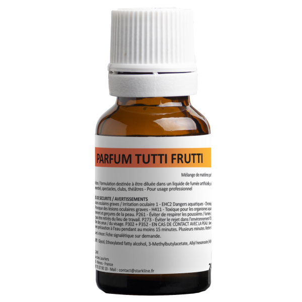 Le parfum tutti frutti de StarkLine transforme vos effets de fumée en une expérience olfactive inoubliable. Grâce à sa senteur fruitée, ce parfum pour liquide à fumée apporte une ambiance gourmande et festive idéale pour les événements live, soirées en club ou animations scéniques. Ce produit permet d’ajouter une dimension sensorielle originale à vos shows tout en restant discret et subtil.