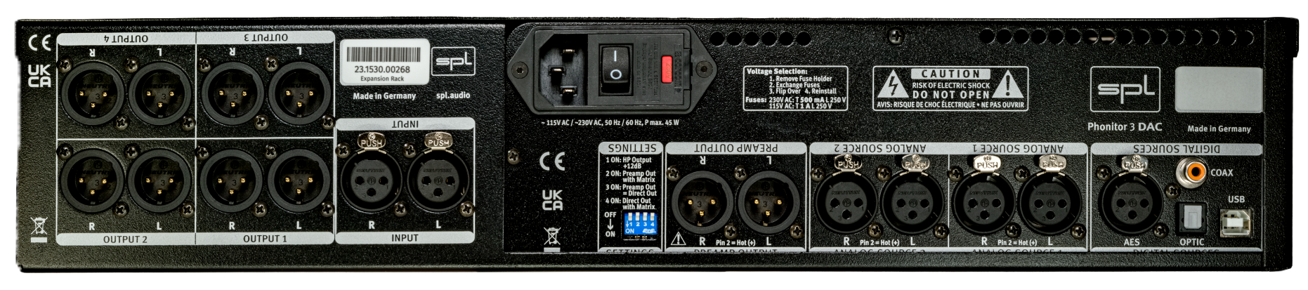 Le SPL Expansion Rack se connecte via l’entrée XLR stéréo au Phonitor 3 DAC. Il suffit de relier la sortie principale du DAC à l’entrée du rack, puis de brancher jusqu’à quatre paires d’enceintes stéréo sur les sorties XLR. Aucun câble spécial ni alimentation n’est nécessaire grâce à sa conception passive.