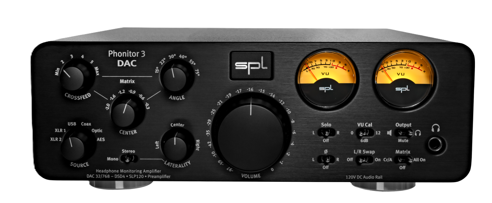 Le SPL Phonitor 3 DAC est un amplificateur casque haut de gamme intégrant un contrôleur de monitoring et un convertisseur numérique-analogique avec technologie 120V. Il propose des connexions numériques USB, AES/EBU, S/PDIF optique et coaxial, ainsi que deux entrées analogiques XLR stéréo. Grâce au DAC768v2 (AK4493 SEQ) et à la technologie SLP120, il délivre un son extrêmement détaillé et dynamique. Compatible PCM jusqu’à 768 kHz et DSD jusqu’à DSD256, il s’adapte parfaitement à une utilisation en studio ou mastering. Le Phonitor Matrix simule l’écoute sur enceintes pour un mixage précis au casque. Il offre aussi un contrôle complet du monitoring (M/S, inversion de phase, mono/stéréo) et une sortie enceinte avec ou sans contrôle de volume.