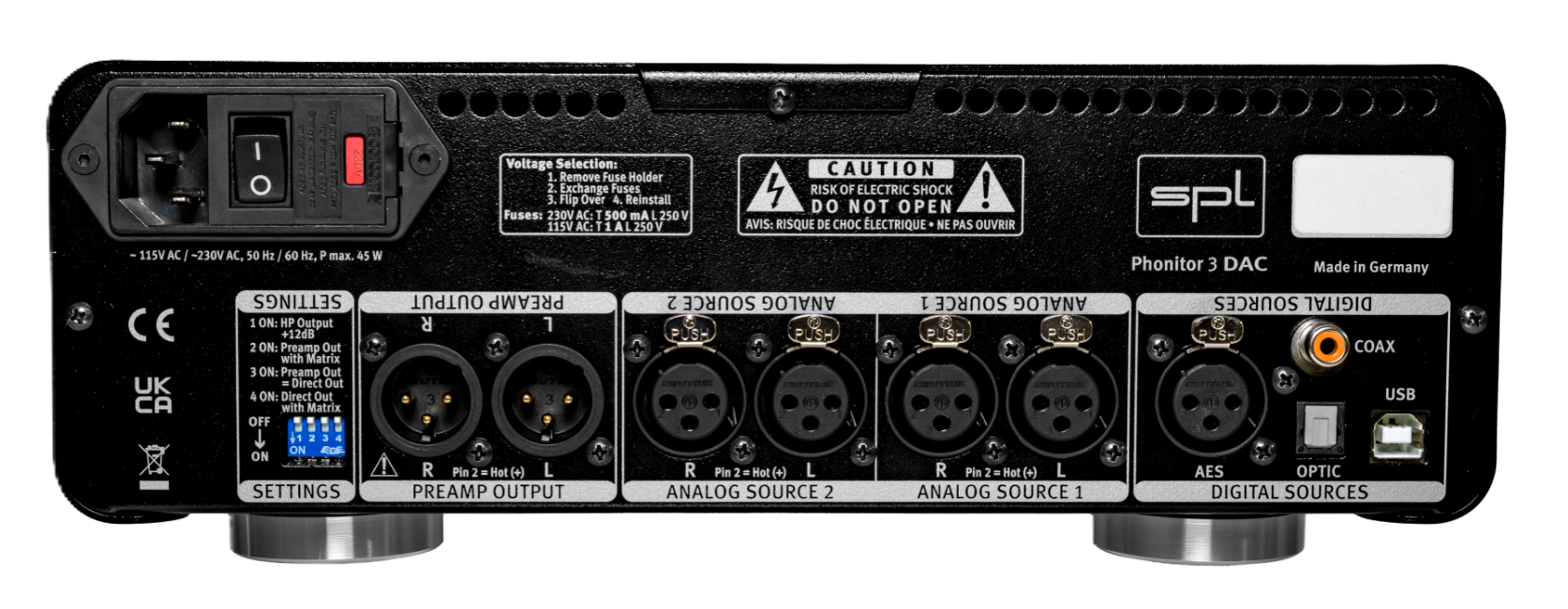 Le SPL Phonitor 3 DAC accepte jusqu’à six sources audio stéréo : deux analogiques (XLR) et quatre numériques (USB, AES/EBU, S/PDIF optique et coaxial). La sélection de la source se fait simplement via un commutateur rotatif. La compatibilité USB permet une intégration directe aux stations DAW sans installation de pilote (Mac/iOS), avec prise en charge jusqu’à 768 kHz/DSD256.
