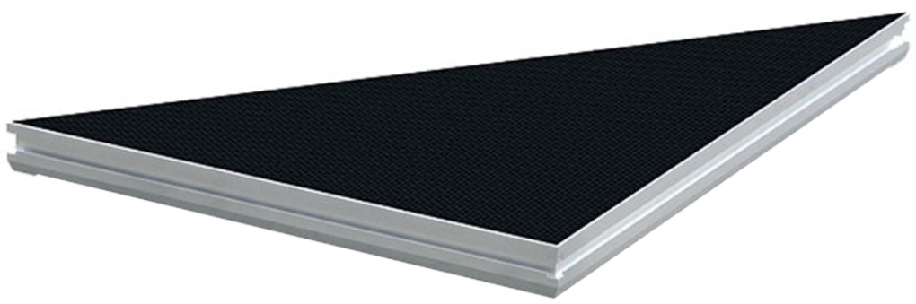 La plateforme triangulaire ConteStage PLTS-T1x1 est pensée pour les configurations scéniques modulaires en intérieur comme en extérieur. Sa structure associe un cadre en aluminium et un plateau en contreplaqué multiplis de bouleau de 12 mm, avec une finition noire antidérapante sur le dessus. Cette conception répond aux besoins de montage, de stabilité et de circulation sur scène, tout en conservant un poids limité de 8 kg pour simplifier la manipulation.
