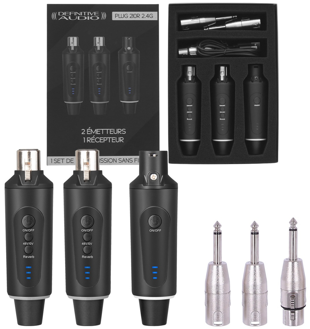 Le Definitive Audio PLUG 210R 2.4G est un système de transmission sans fil conçu pour micros dynamiques ou à condensateur. Il se compose de deux émetteurs et d’un récepteur rechargeable au format XLR. Il fonctionne sur la bande 2.4 GHz avec une portée de 50 mètres, propose une autonomie de 8 heures, une alimentation fantôme 48V et trois types de réverbérations intégrées. Compact, fiable et simple à utiliser, il est idéal pour les professionnels du son en recherche de mobilité et de qualité audio sans compromis.